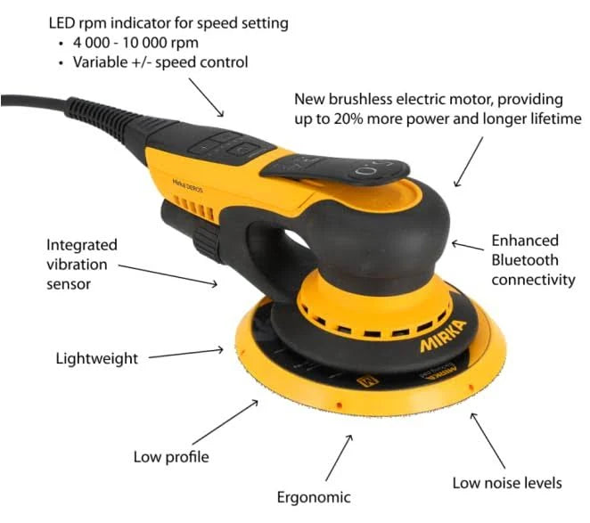 The Mirka DEROS II 650 is a 150 mm direct electric random orbital sander developed for effective and dust-free sanding of all kinds of surfaces. The Mirka DEROS II 650 has a 150 mm pad and 5.0 mm oscillation. The 5.0 mm oscillation is suitable for general purpose sanding, it is the oscillation most commonly used and achieves a good balance between stock removal and surface finish. The effective Mirka DEROS II is a compact and easy-to-use electric sander. The next generation Mirka DEROS II continues the story of the successful orbital sander with numerous improvements for the user. The low-profile and lightweight Mirka DEROS sander is well known for its leading ergonomics and balanced feel, with operator comfort at a high standard. Mirka DEROS II can be used for long periods without fatigue due to its low noise level and low vibration values. The new design makes it even easier for the operator to adjust the sanding speed: in addition to the easy-to-operate lever for adjusting sanding speed, the Mirka DEROS II also features clearly visible LED indicators for the speed selector and a separate on/off switch. Thanks to the long-life and high efficiency brushless motor, the Mirka DEROS II maintains a consistent speed and can effortlessly tackle also demanding jobs and heavy applications. As part of the Mirka dust-free sanding solution, the Mirka DEROS enables efficient dust-free sanding