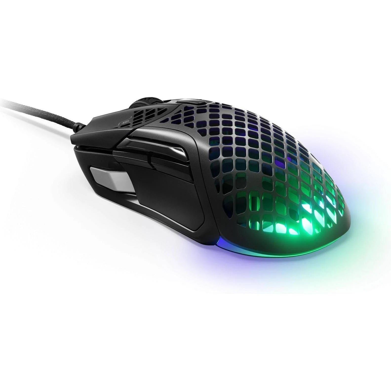 The SteelSeries Aerox 5 is a wired gaming mouse for right-handers. The high-precision SteelSeries TrueMove Air sensor, offers a max. resolution of 18K DPI. The tournament mouse also shines with a max. acceleration of 40 G and 400 IPS to reliably process fast mouse movements of low-sensitivity gamers. The 1,000 Hz afragerate of the SteelSeries Aerox 5 Wireless ensures fast communication between mouse and processor in a 1-ms interval and a delay-free transmission. As a result, every keystroke is processed in near real time to respond appropriately to any gaming situation. The Golden Micro IP54 switches, which are designed for at least 80 million clicks, ensure long, trouble-free operation. Thanks to these features, the SteelSeries Aerox 5 Wireless is particularly suitable for ambitious gamers and professional eSport players. The upper side of the SteelSeries Aerox 5 Wireless is manufactured in a stylish honeycomb design. Thanks to this, the mouse becomes a real eye-catcher and achieves its light weight of only 66 g. This design also offers functional advantages: It increases air permeability and thus ensures pleasant cooling of the palm on hot summer days and prevents perspiration. This also increases the grip of the mouse, whether claw grip or palm grip. Despite the open design, you don't have to worry about moisture, as the mouse is protected against splashing water with IP-54. The gaming mouse with activated RGB lighting is an unmistakable eye-catcher. This 3-zone lighting is located on the underside of the mouse, below your palm. This way, the RGB lighting will never bother you. The RGB lighting can be configured as desired via the SteelSeries Engine. The mouse offers a total of nine programmable buttons: two main buttons for right and left click, five thumb buttons, a clickable scroll wheel and a dedicated DPI slider. Excellent glide with minimal friction is provided by the G-Skates