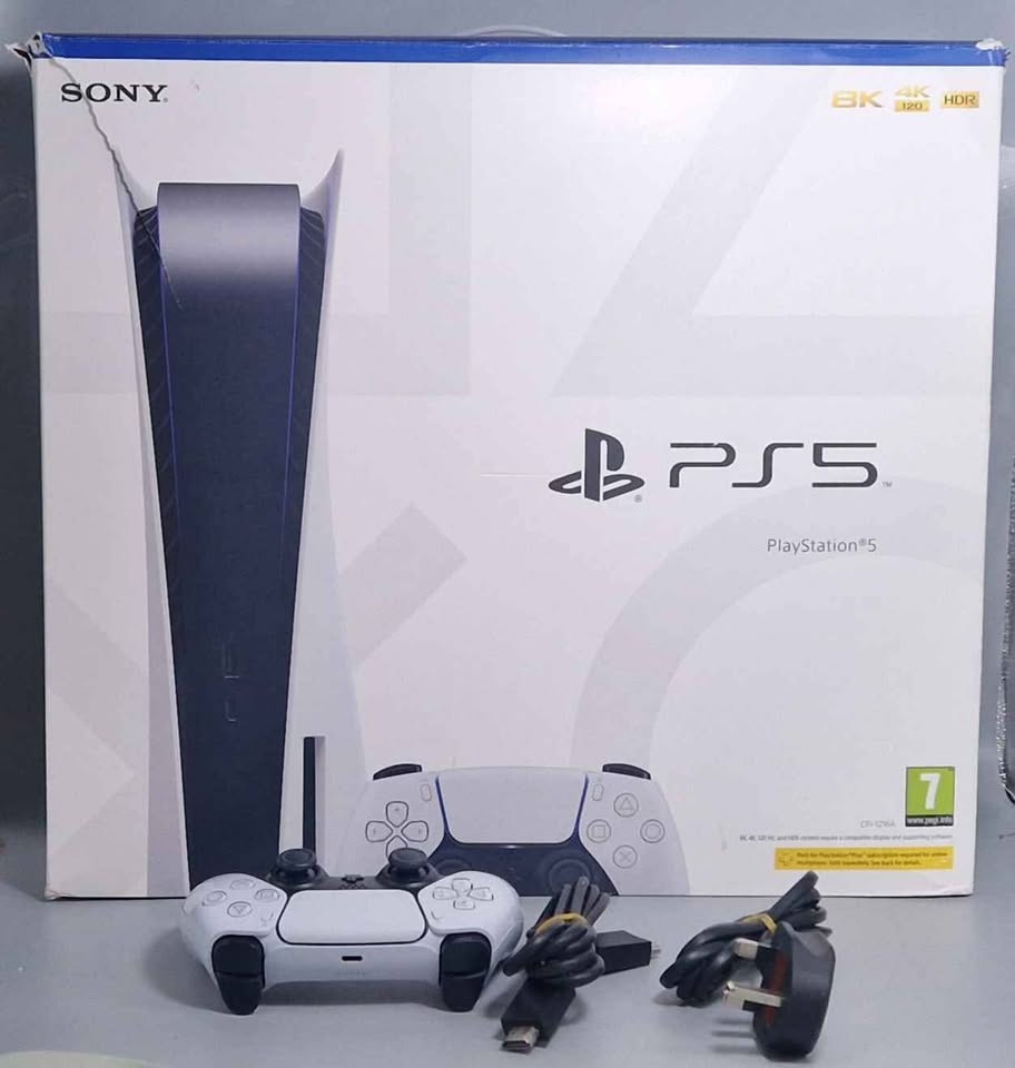 PlayStation 5 Console, 825GB, White, Boxed perfect working condition, excellent physical condition, has some age/use relate wear and tear, controller has some extra wear on the sticks
