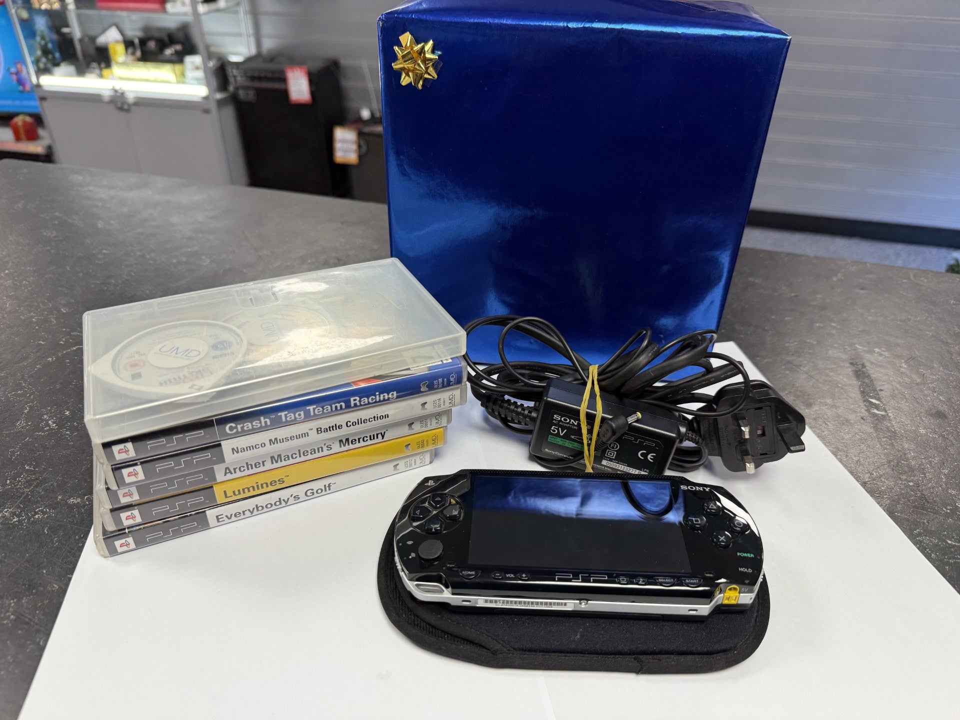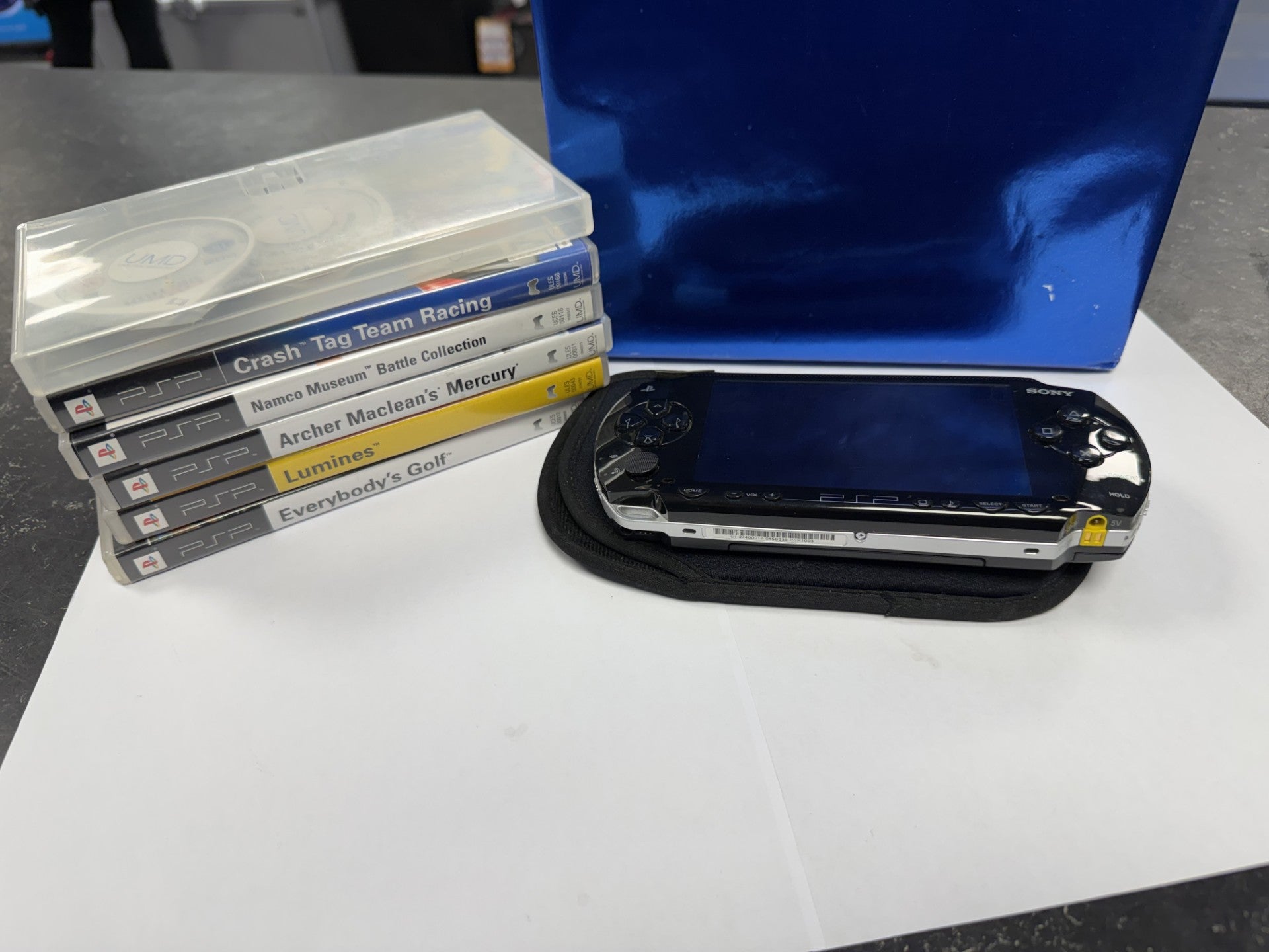 • includes official Sony charger • with games and UMD • good condition has some minor wear to case and some marks to screen but nothing major