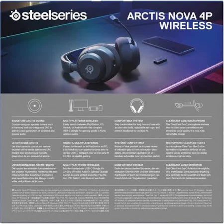 Venture past the mundane into Almighty Audio with the Arctis Nova 4P Wireless. The Nova Acoustic System includes custom audio drivers, 360-degree Spatial Audio, and 10-band Parametric EQ from Sonar Software. AI algorithms eliminate outside noise while using the completely retractable mic with Sonar. Bring gaming-grade 2.4GHz Quantum 2.0 Wireless to PlayStation, PC, Mac, Switch, and mobile devices with a compact USB-C dongle. The Nova Acoustic System combines hardware and software to elevate your gaming experience. Custom-designed High Fidelity Drivers offer unparalleled sound purity for immersive 360-degree Spatial Audio. Sonar Software gives you X-Ray Hearing, with game-specific presets highlighting critical steps and reloads using the Pro-grade Parametric EQ. Powerful ClearCast AI algorithms work in harmony with new ClearCast Gen 2 mic to silence background noise. The completely retractable bidirectional mic reduces up to 25dB of ambient sound on any platform. Sonar Software's AI can also clean up your squad's voices in addition to your own, removing distractions for you and them. Windows 10/11 required. A 36-hour battery keeps you powered on all day for non-stop play. The USB-C connection offers fast charging when you need it, with just 15 minutes delivering a 6-hour boost.