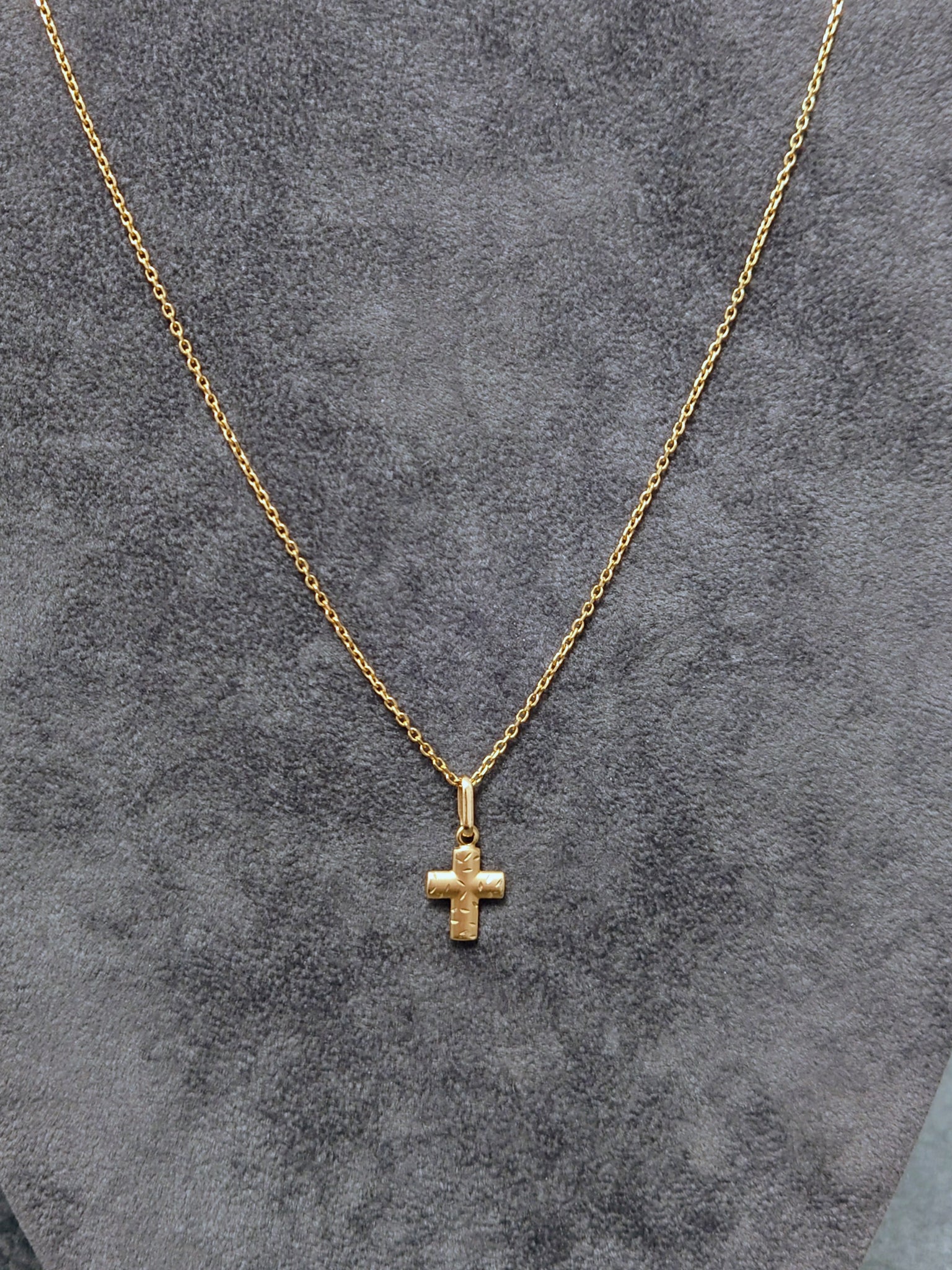 A pretty 14ct yellow gold satin & diamond cut small cross & oval belcher chain. Please note the polished reverse of the cross has a very very tiny dent at the base which does not detract from the the lovely appearance of the little cross & chain. The 16" chain is ideal for the smaller neck or a great gift for a child's first gold necklace.