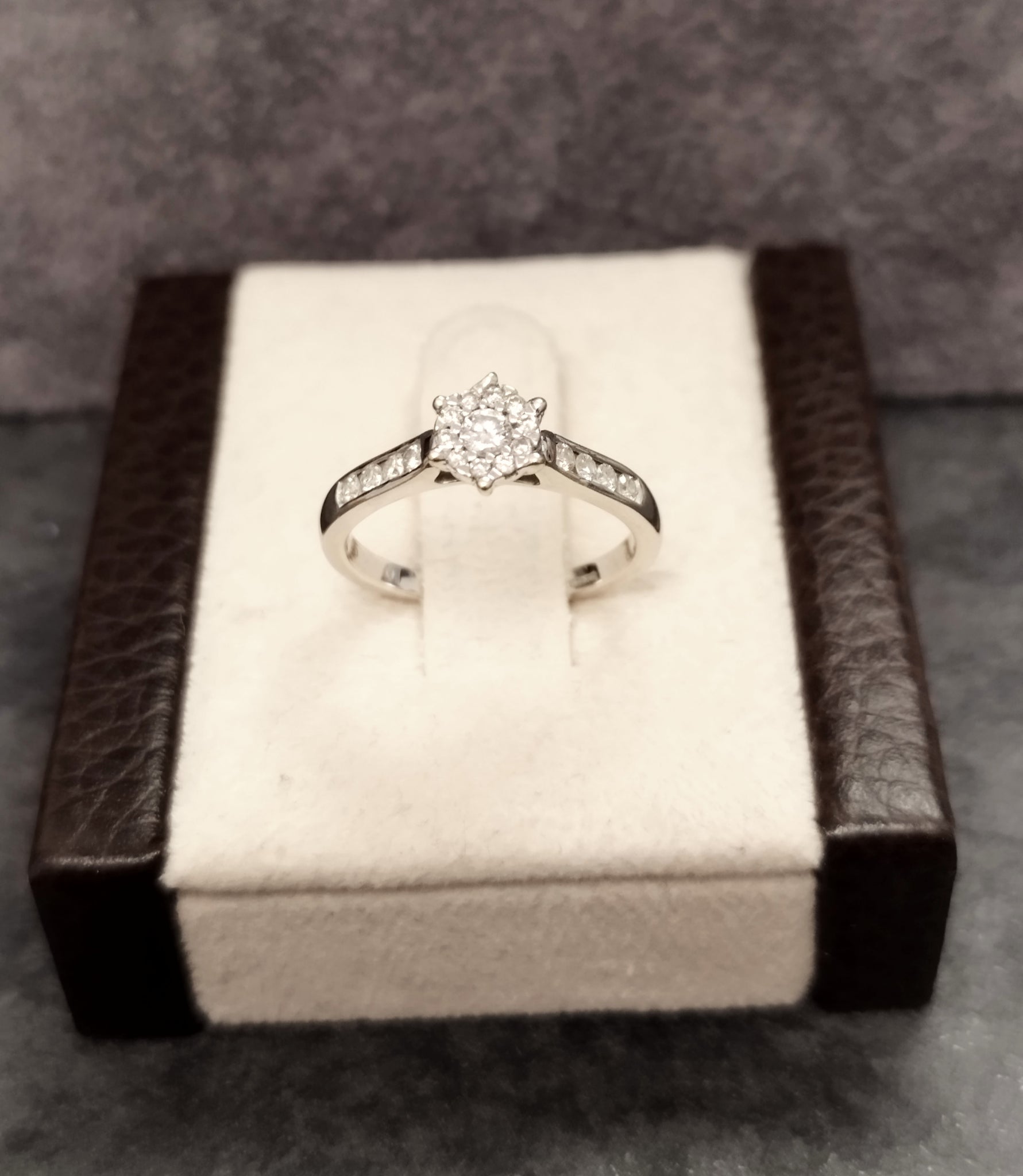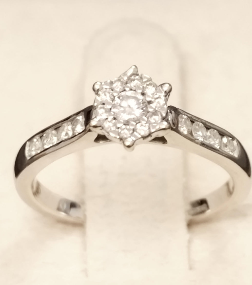 Crafted in 9ct white gold, this beautiful ring is set with 0.25 points of diamonds in both a cluster setting and bezel settings on the shoulders creating an all round stunning design. Ideal for everyday wear or as a superb engagement ring.