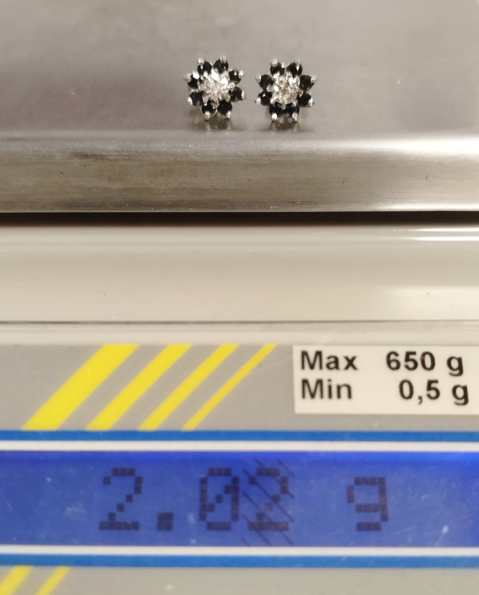 A very pretty pair of 9ct white gold cluster stud earrings. Set with 1 clear central stone & 8 dark blue surrounding stones.