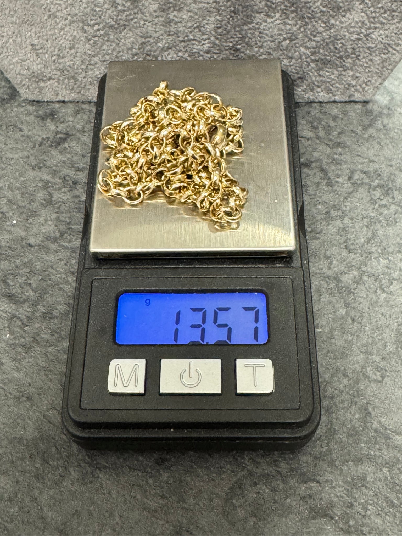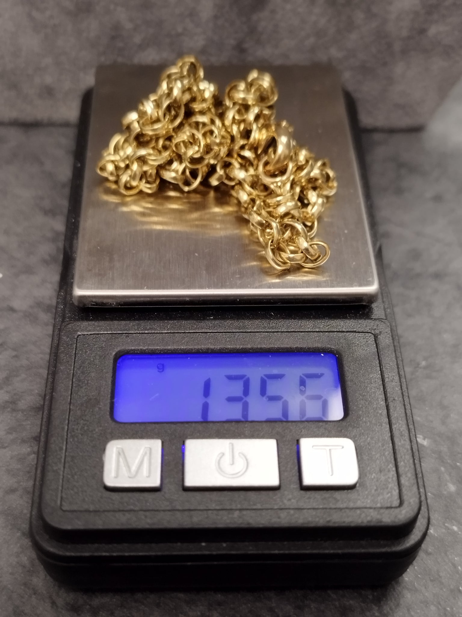 A classic 9ct yellow gold round belcher chain weighing 13.56g and measuring 24.5 inches in length. This timeless design unisex chain will complement any outfit making it a perfect gift.