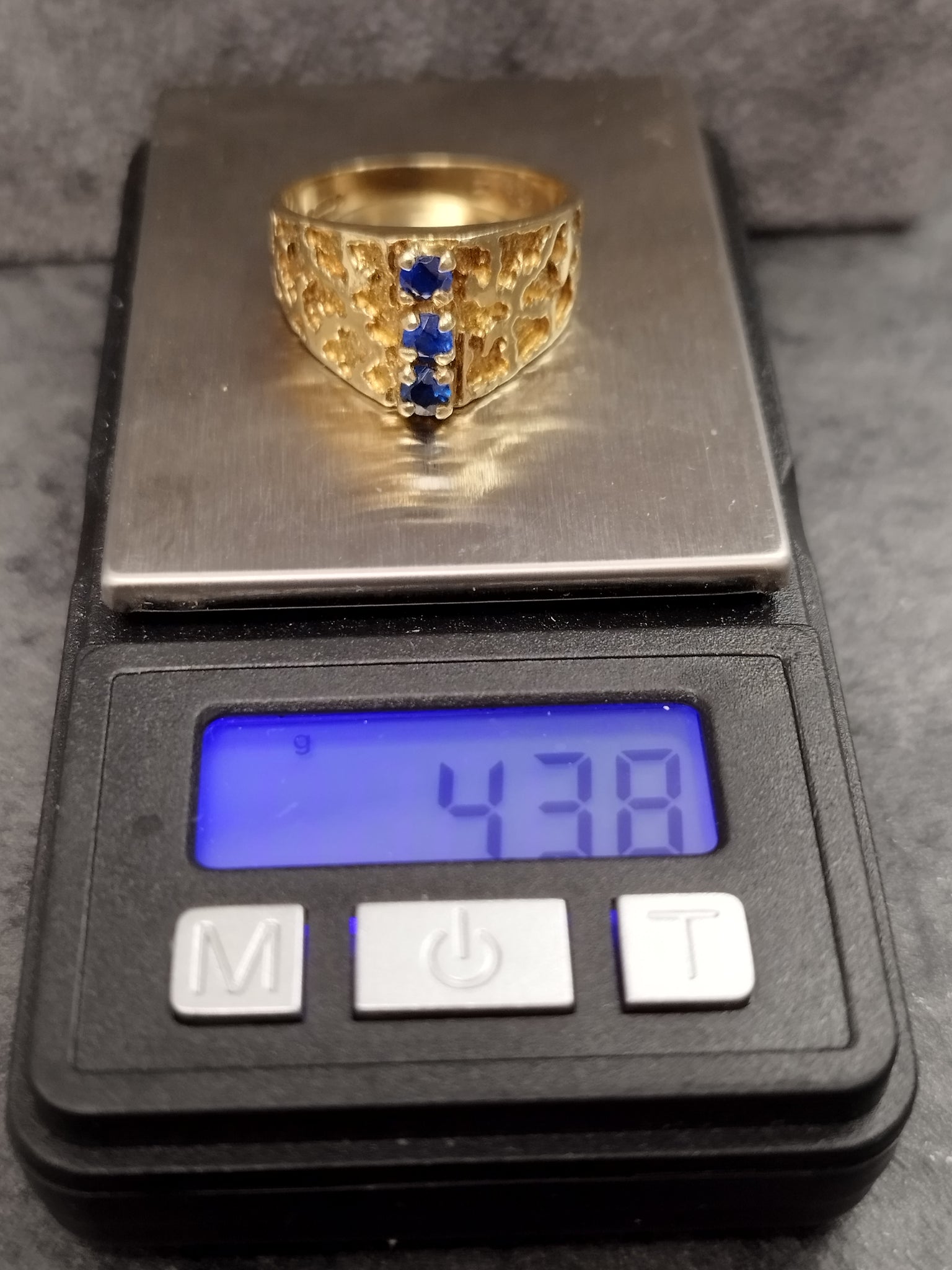 A 9ct yellow gold 'Antique' style trilogy ring set with 3 blue stones. The trilogy ring represents the 'past' 'present' & 'future.' The saddle style shoulders feature a 'nugget' effect design creating a highly textured finish.