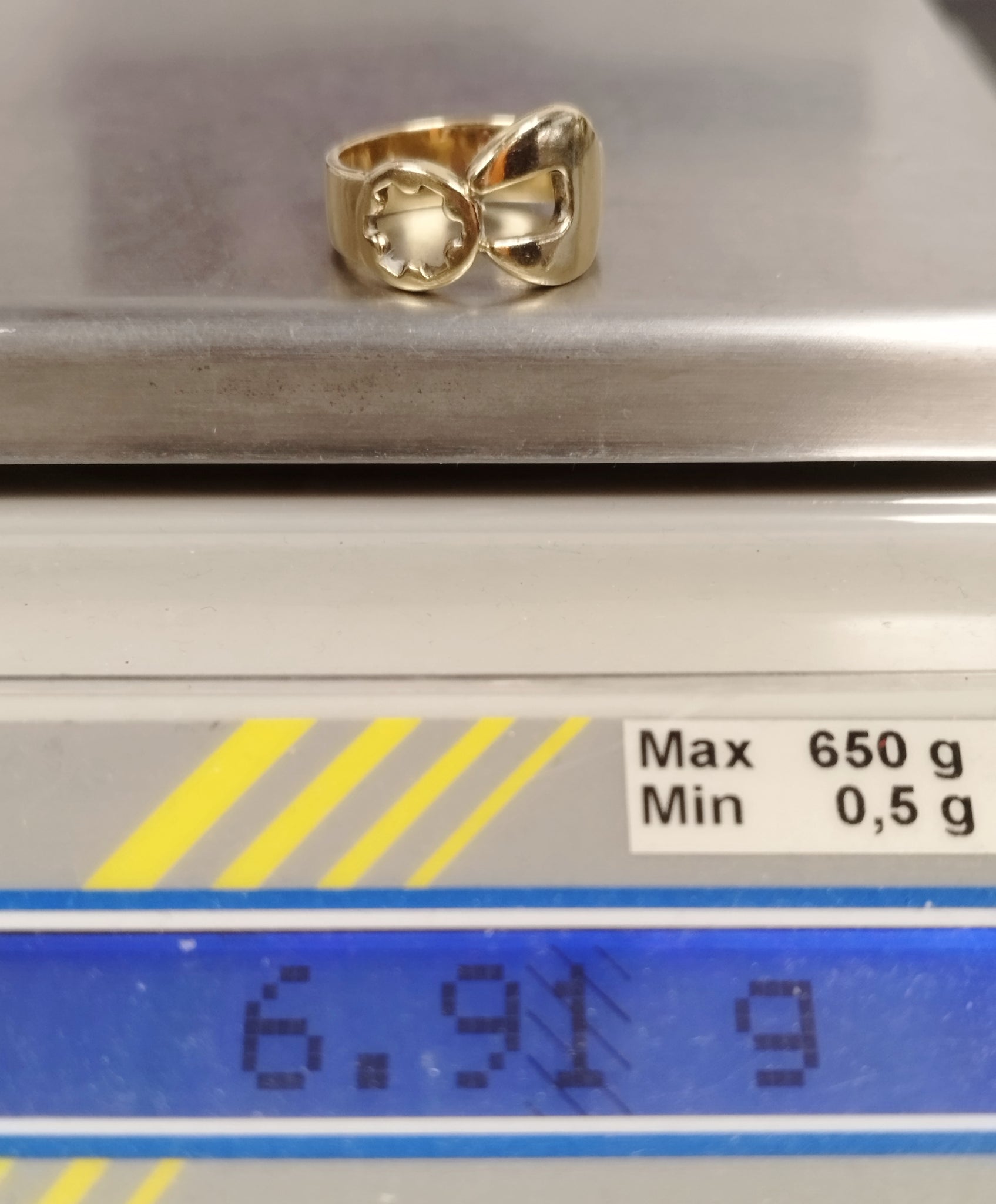 This 9ct yellow gold spanner & torque design ring would make the Ideal gift for the car or mechanics fan. Features an textured in lay along the outer shank of the spanner handle with the 2 ends joined together forming the ring shape.
