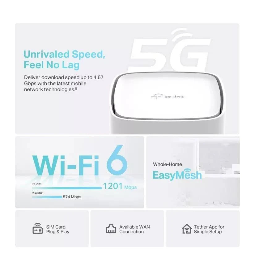 Unrivaled Speed with 5G, Revolutionary Experience Take advantage of your advanced 5G network with download speeds up to 4.67 Gbps. Share your 5G network with multiple Wi-Fi devices and enjoy uninterrupted Ultra HD movies, blazingly fast file downloads, and smooth video chats and video conferences. At the same time, NX200 is backward compatible with 4G mode.? Plug and Play, Enjoy 5G Network Everywhere Simple, just one SIM card Traditional broadband or cable installation is expensive and time-consuming for your vacation home, farm, or suburban warehouse. Long contract periods also create headaches for short-rentals, pop-up venues, and temporary shops to access the internet. Archer NX200 ensures a comfortable and no-block network installation. Plug in your SIM card and enjoy high-speed internet! Powerful Wi-Fi 6 Armed with WiFi 6 technology, NX200 is designed to deliver a huge boost in coverage, speed, and total capacity. Get on the latest mesh WiFi to enjoy the future network that loads.