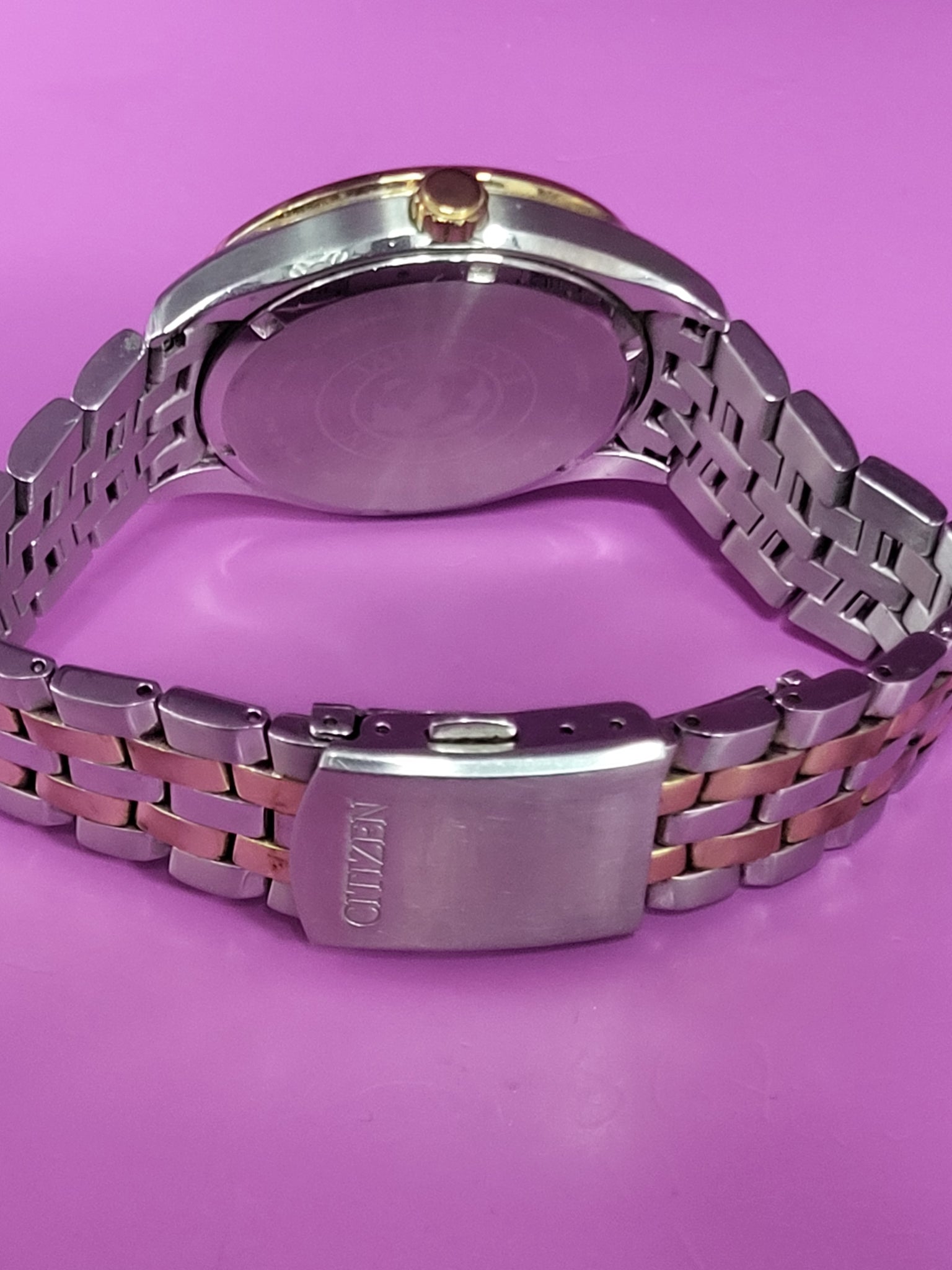 Citizen Corso eco drive Gents watch - 2 tone stainles steel bracelet (L) with black face and rose gold numerals - Watch is in good all round condition - no marks or scratches to the glass - attractive 2 tone bracelet and is Large in size ( can be shotened - come with generic presentation Box - there is a small amout of wear on the outer side of the clasp which is fairly normal on a pre owned watch