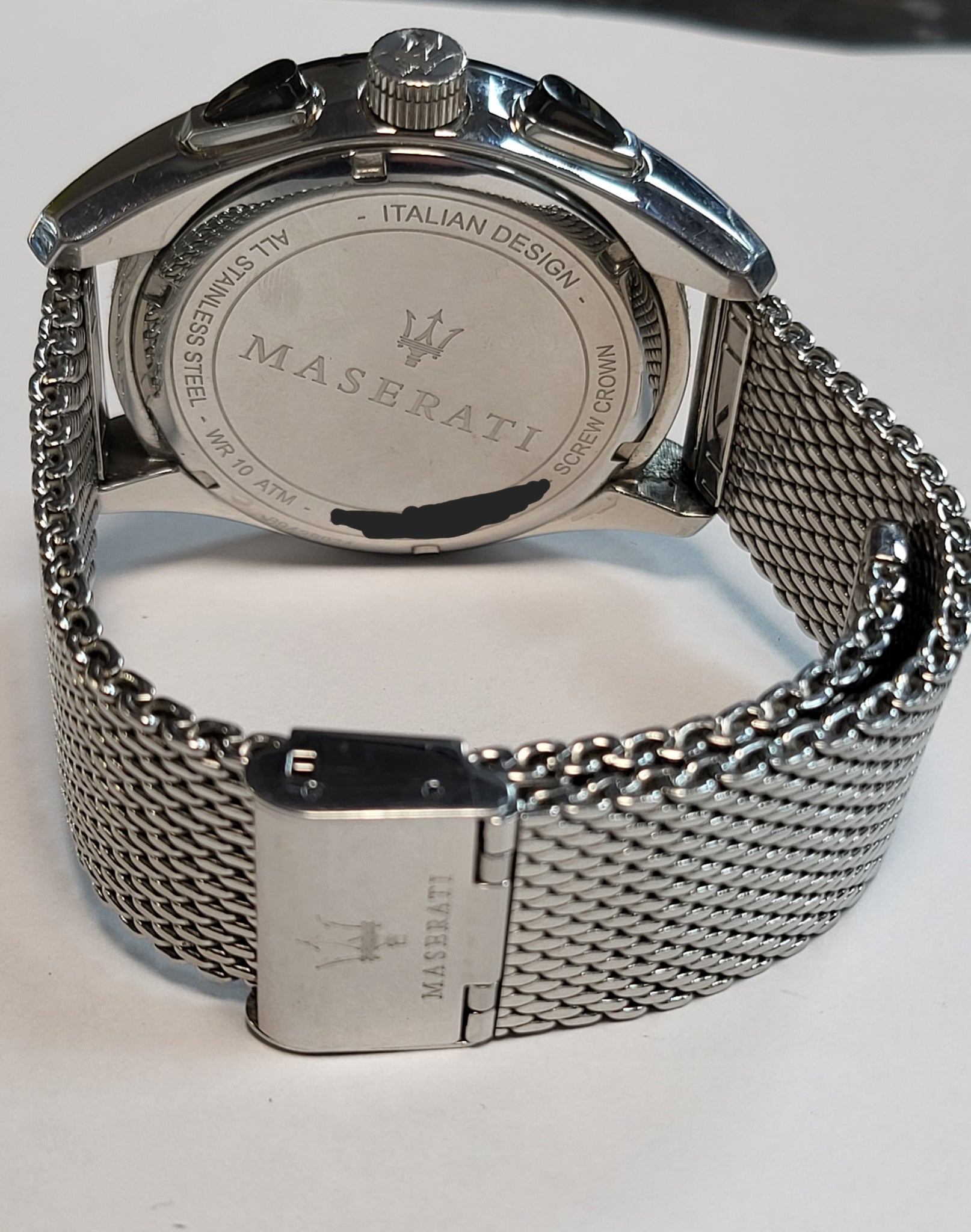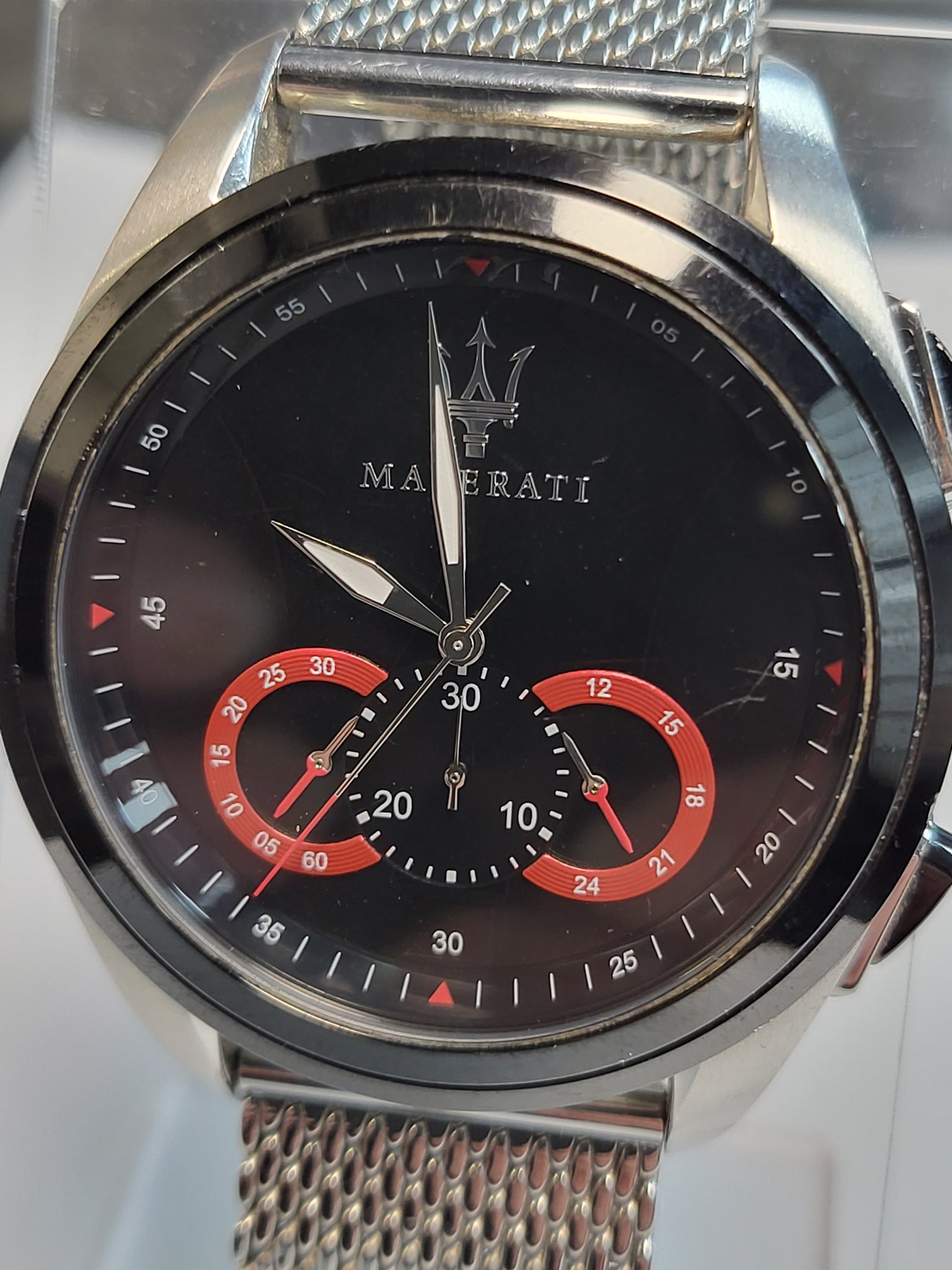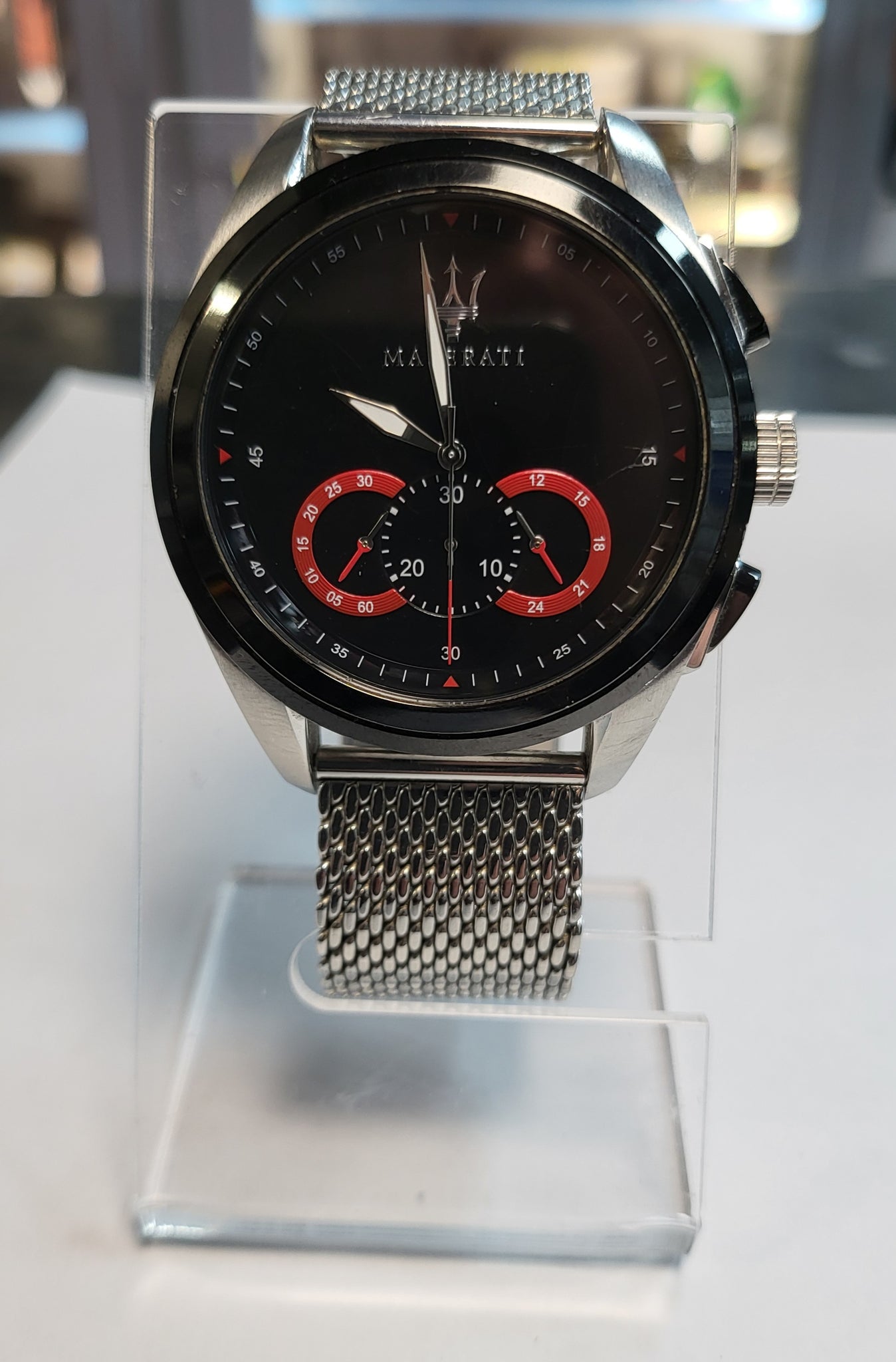 Maserati Traguardo 45mm watch R8873612005 This Maserati Traguardo watch for men combines sporty style with elegance in a steel case with a steel strap and Milanese mesh. Featuring the 3-dial chrono design at the bottom on a black dial with red accents. The movement of the Maserati watch is quartz in a 45 mm diameter steel case with a Milanese mesh steel strap. Black dial with red details. Screw-down caseback and screw-down crown. mineral crystal. Water resistance 100 meters (10 BAR) Its functions include giving the hours, minutes and seconds and the chronograph counter.