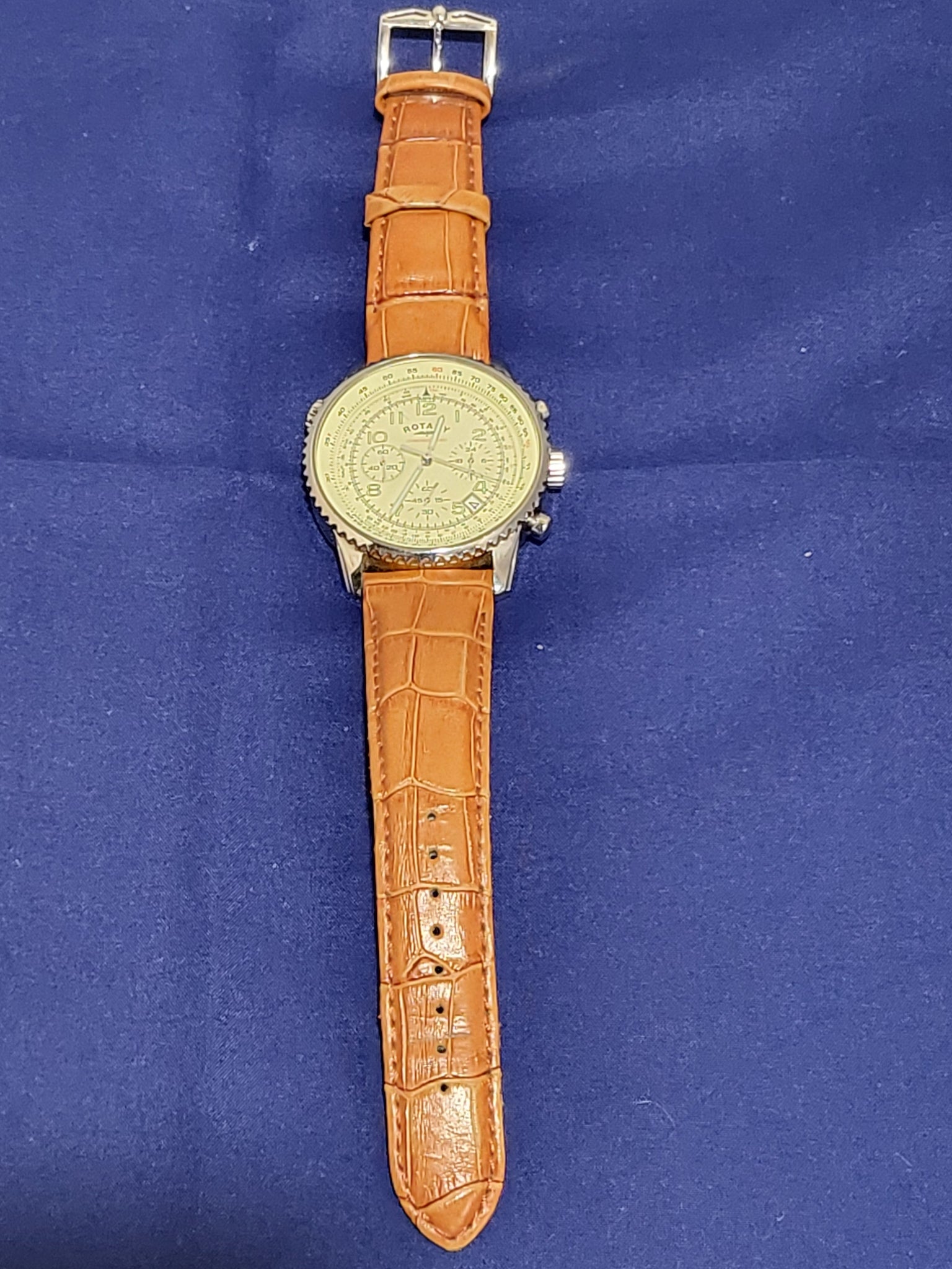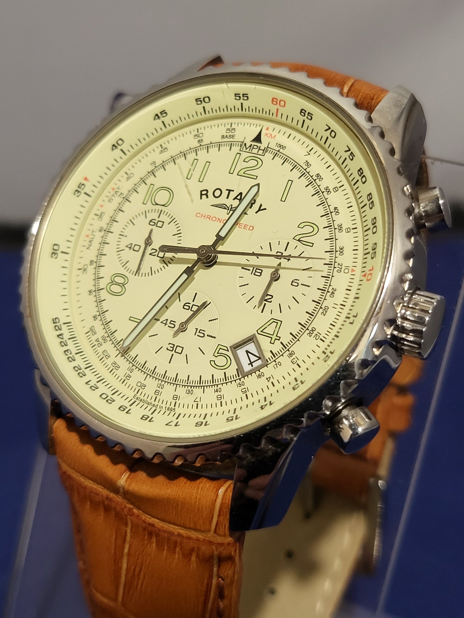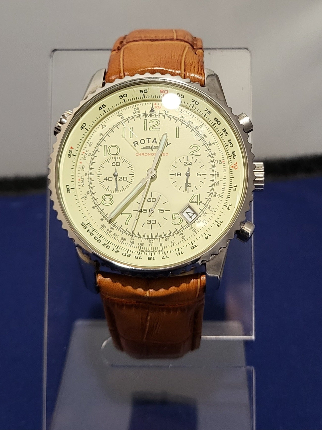 The Rotary Chronospeed Men's Watch features a cream dial with Arabic numerals and a date indicator, housed in a 42mm stainless steel case with a silver finish. This stylish timepiece has a brown leather strap with a buckle closure, showcasing a casual yet sophisticated look suitable for everyday wear. The watch is water-resistant up to 50 meters and features a quartz movement, making it a reliable choice for any occasion.