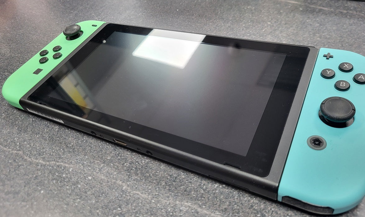 The Nintendo Switch Animal Crossing: New Horizons Edition (32GB) is a standard model console featuring a unique, themed design with pastel green and blue Joy-Con controllers, a special console back pattern, and a themed white dock.