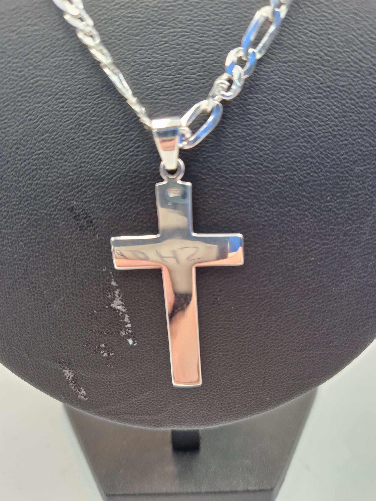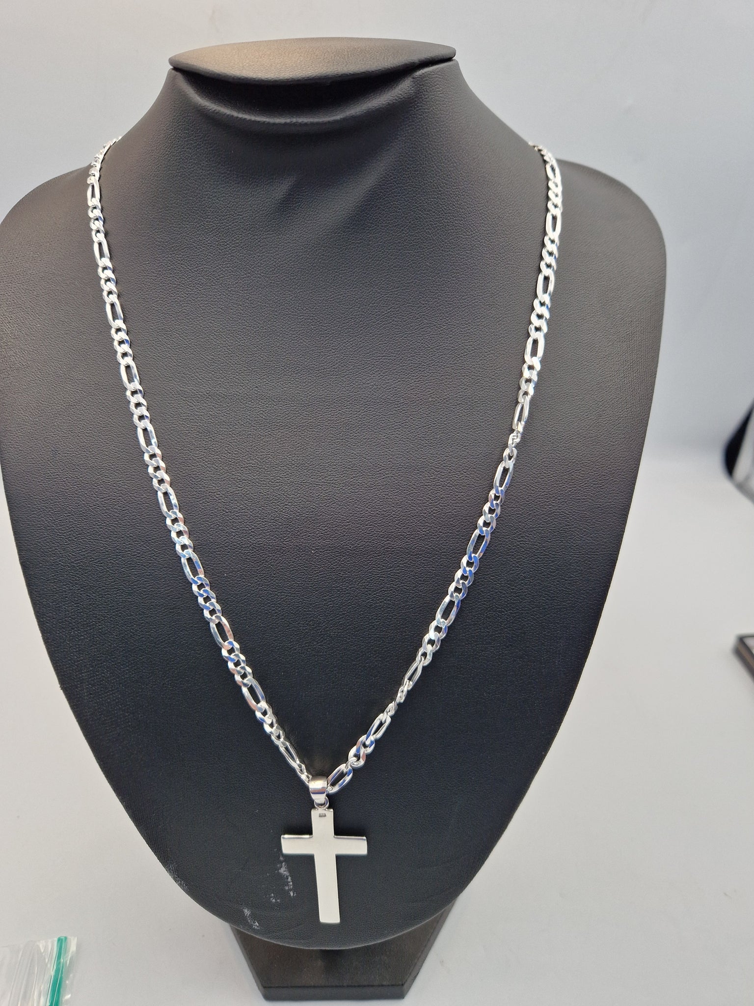 925 Sterling Silver 3 IN 1 Figaro Chain Necklace With Cross Pendant - 24" Long - 21.1 Grams - 4mm Wide **BRAND NEW**