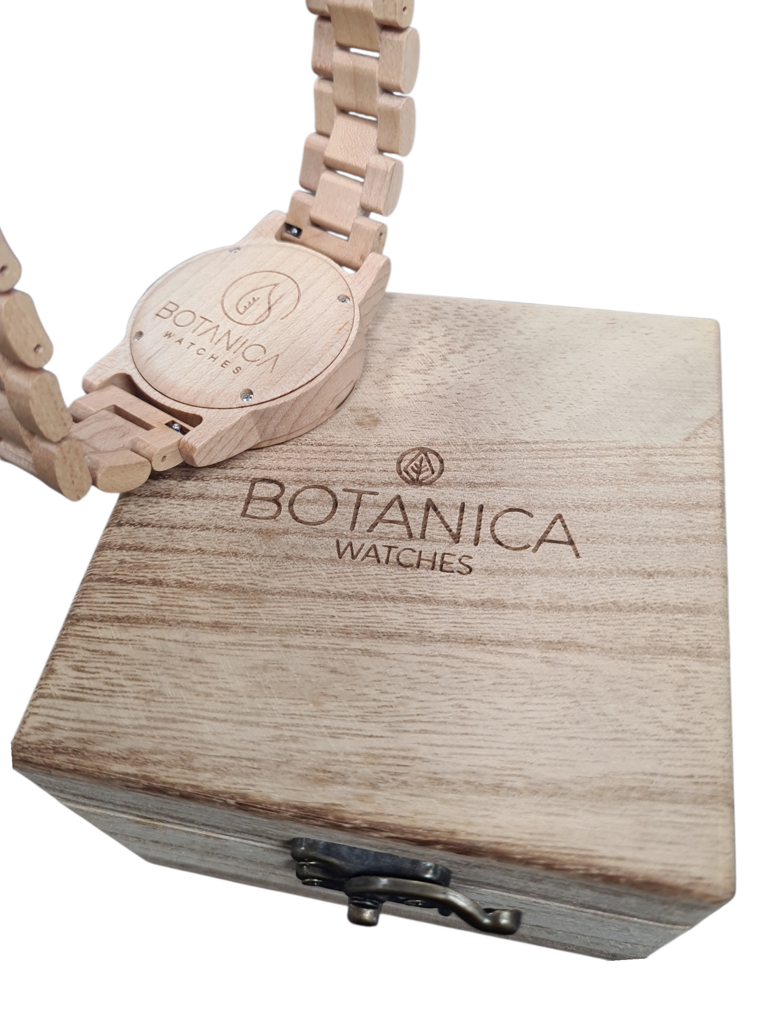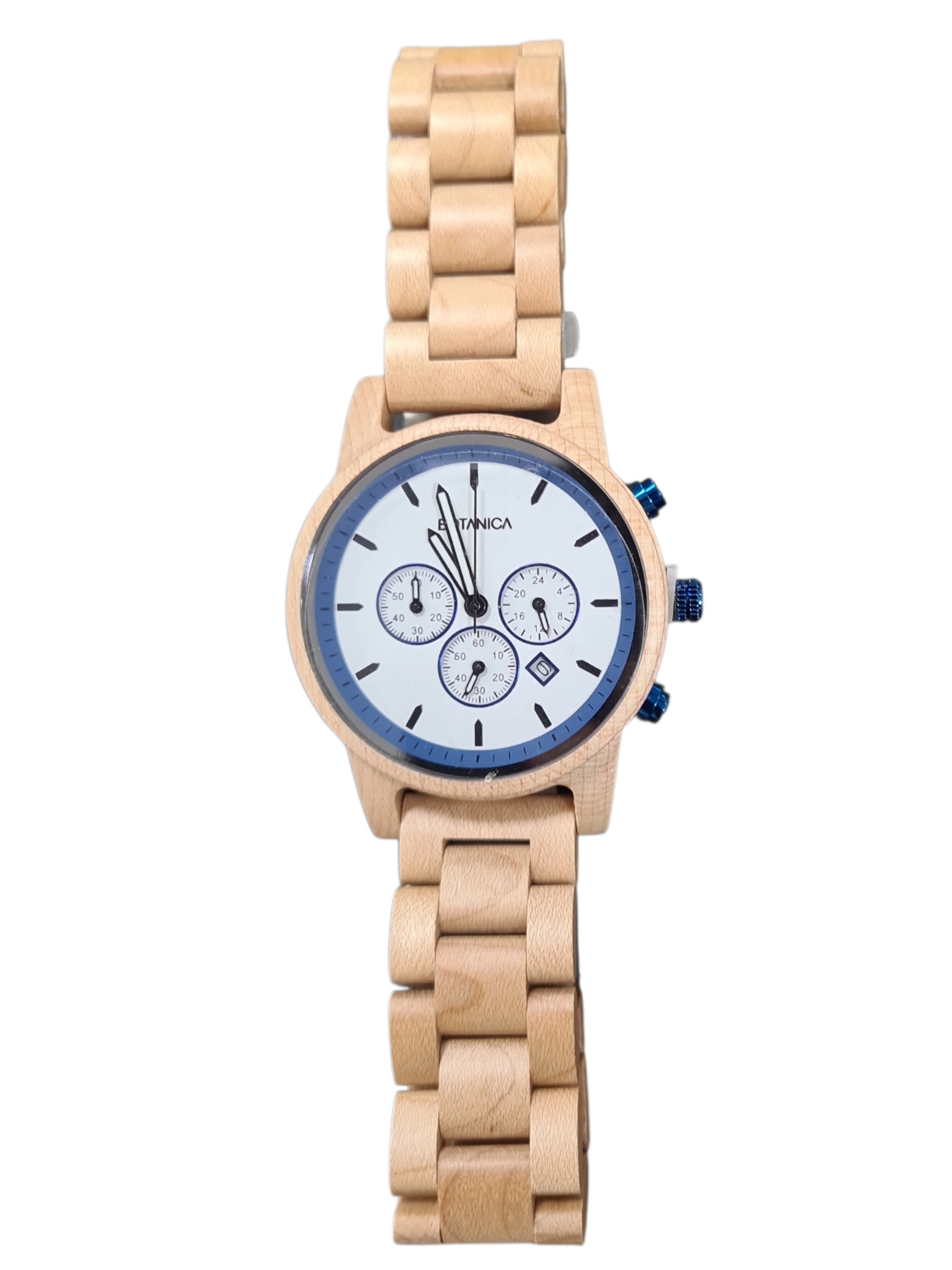 The Alder Woodlink Zebrano watch by Botanica is a distinctive 42mm wooden timepiece featuring a Zebrano hardwood case with striking blue accents, a reliable Miyota 2035 quartz movement, and a comfortable genuine leather strap, offering a lightweight, hypoallergenic, and unique accessory with eco-friendly appeal, often coming in a branded wooden box and available with interchangeable straps. Key Specifications: Case: 42mm, made from natural Zebrano wood. Movement: Miyota 2035 (Quartz). Dial: Features a contrasting blue face with silver markings. Strap: Genuine leather, often interchangeable with other options like vegan or matching wood straps. Design: Unique grain pattern due to natural materials, Roman numeral indices, lightweight. Features: Hypoallergenic, water-resistant (to some extent), comes in a wooden box. Key Features & Selling Points: Unique Aesthetic: Each watch has a distinct wood grain, making it one-of-a-kind. Eco-Friendly: Botanica partners with tree-planting initiatives. Versatile: Interchangeable straps allow for customization. Handcrafted Feel: Emphasizes natural materials and artisanal design. This watch combines natural beauty with dependable technology, appealing to those seeking a blend of style, sustainability, and individuality, notes Botanica Collective and TJC.