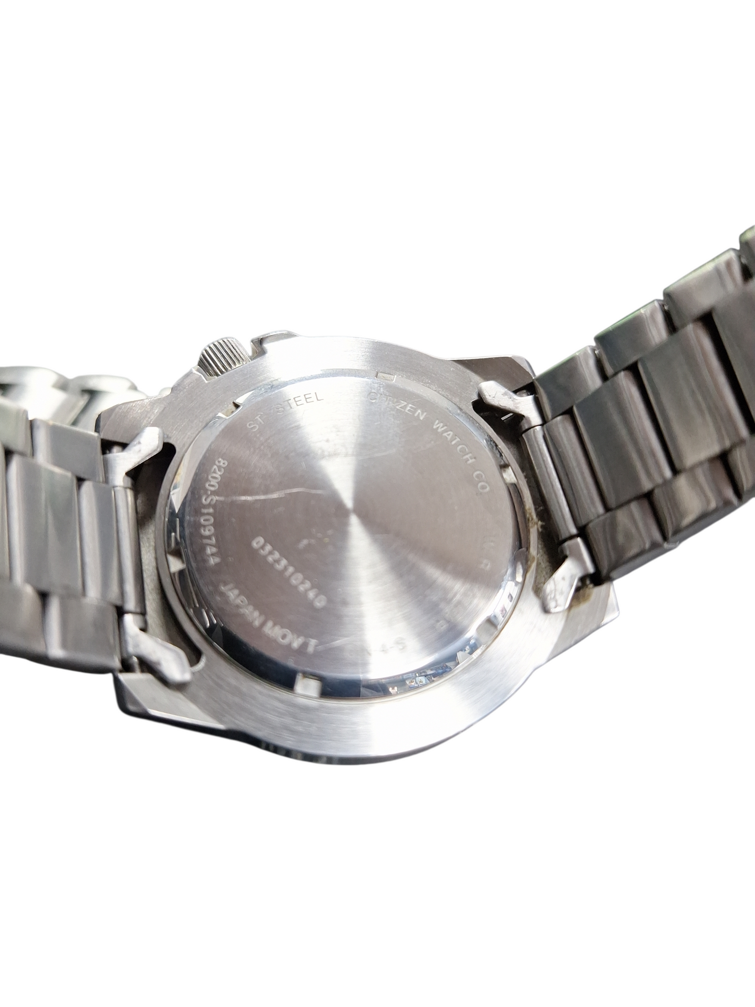The Citizen NH8388-81E is a men's stainless steel automatic watch featuring a black dial, Caliber 8200 movement, 46mm case, mineral crystal, luminous markers, day/date display, and 100m water resistance, ideal for daily wear or sports with its robust build and reliable self-winding functionality. Key Specifications: Movement: Automatic (Caliber 8200), self-winding and hand-winding capable. Case: Stainless Steel, ~46mm diameter, ~13mm thickness, round shape with a screw-in back. Dial: Black analog display with luminous hands and markers for low light visibility. Crystal: Mineral glass. Functions: Hour, Minute, Second, Day & Date display. Bezel: Black, unidirectional, with 60-minute markers (for the sport/diver style). Bracelet: Stainless Steel with a deployment or push-button clasp. Water Resistance: 100 meters (suitable for swimming, not scuba diving). Weight: ~186g. Features & Style: Style: Marine Sport, modern, with a robust, functional look. Dial Details: Subtle design with a stepped outer ring and metallic edge. Crown: Pull/push crown.