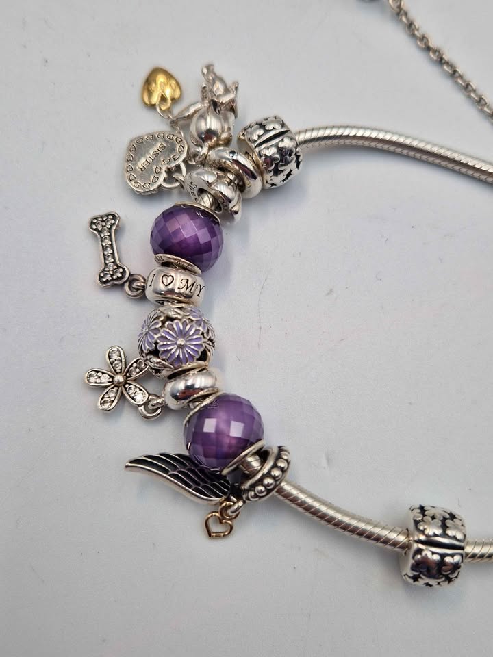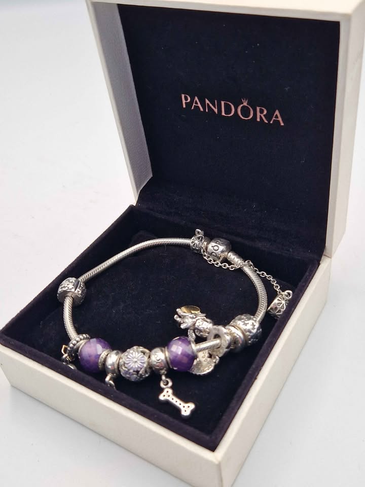 Pandora (ALE 925) Sterling Silver Charm Bracelet With 10x Charms & Safety - 8" Long - Boxed