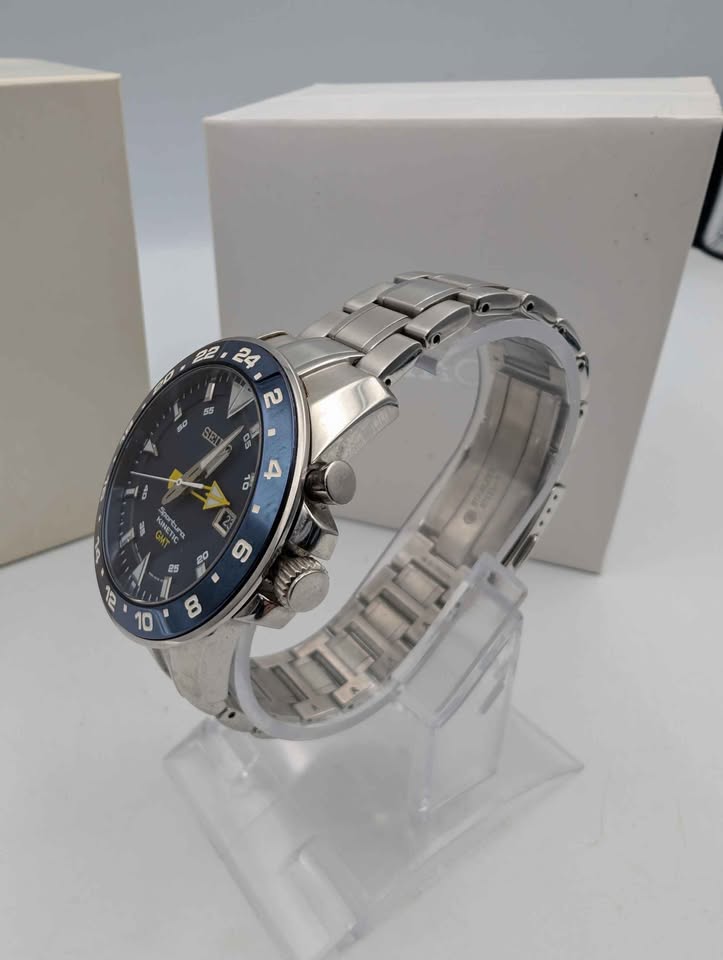 SEIKO Sportura Kinetic GMT 5M85-0AA0 Silver Blue Dial Men's Watch - Boxed With Steel Bracelet