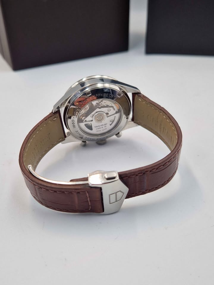 Movement: Powered by the automatic TAG Heuer Calibre 16 movement (based on the reliable ETA 7750 or Sellita SW500), which is a self-winding mechanical chronograph movement. It has a power reserve of approximately 42 hours. Case: Material: Polished stainless steel. Diameter: 41mm. Case Back: Transparent sapphire crystal exhibition back, allowing view of the movement. Dial and Bezel: Dial Color: Brown dial with index hour markers. Bezel: Fixed brown ion-plated (or aluminum) bezel with a tachymeter scale for measuring speed. Strap/Bracelet: Available on either a brown leather strap with a deployment clasp or a stainless steel bracelet. Functions: Chronograph (measures elapsed time in 60 seconds, 30 minutes, and 12 hours sub-dials). Date display at the 3 o'clock position. Durability: Crystal: Scratch-resistant sapphire crystal.