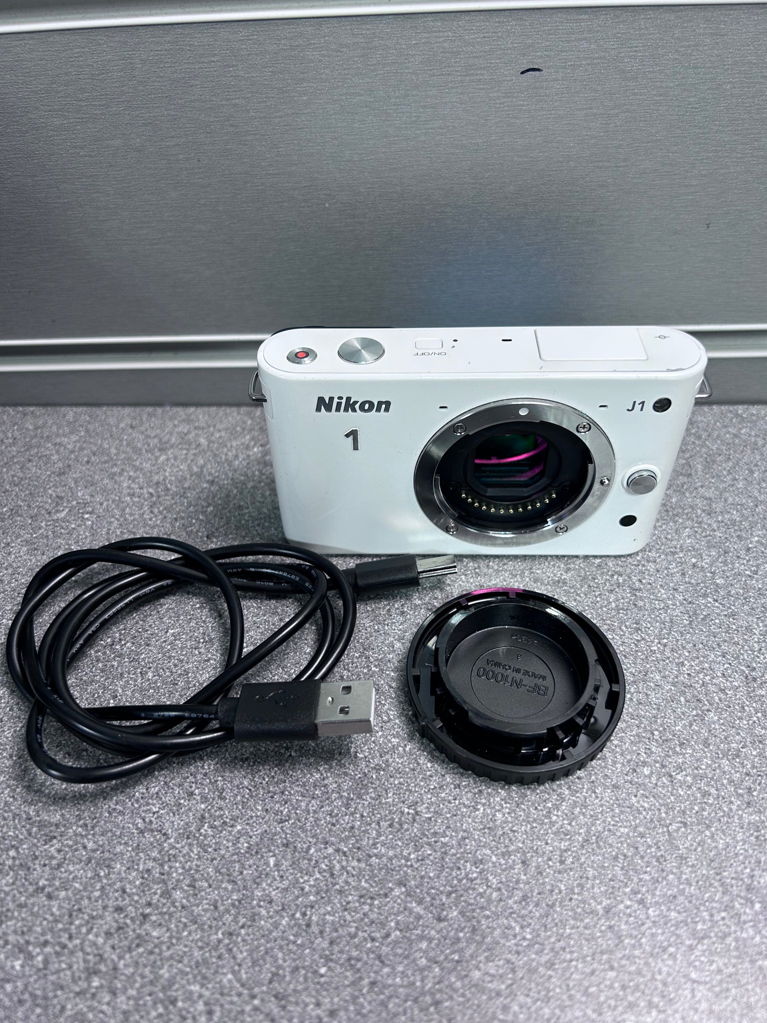 The Nikon J1 is a mirrorless camera with a 10.1MP CX-format CMOS sensor, a hybrid autofocus system, and a maximum continuous shooting speed of 60 fps. It features a 3-inch LCD screen, a built-in flash, and can record video up to 1080p resolution. Its shutter speed ranges from 30 seconds to 1/16,000 of a second, and it uses an EN-EL20 lithium-ion battery. Fully tested and working comes with charging lead 1 year warranty