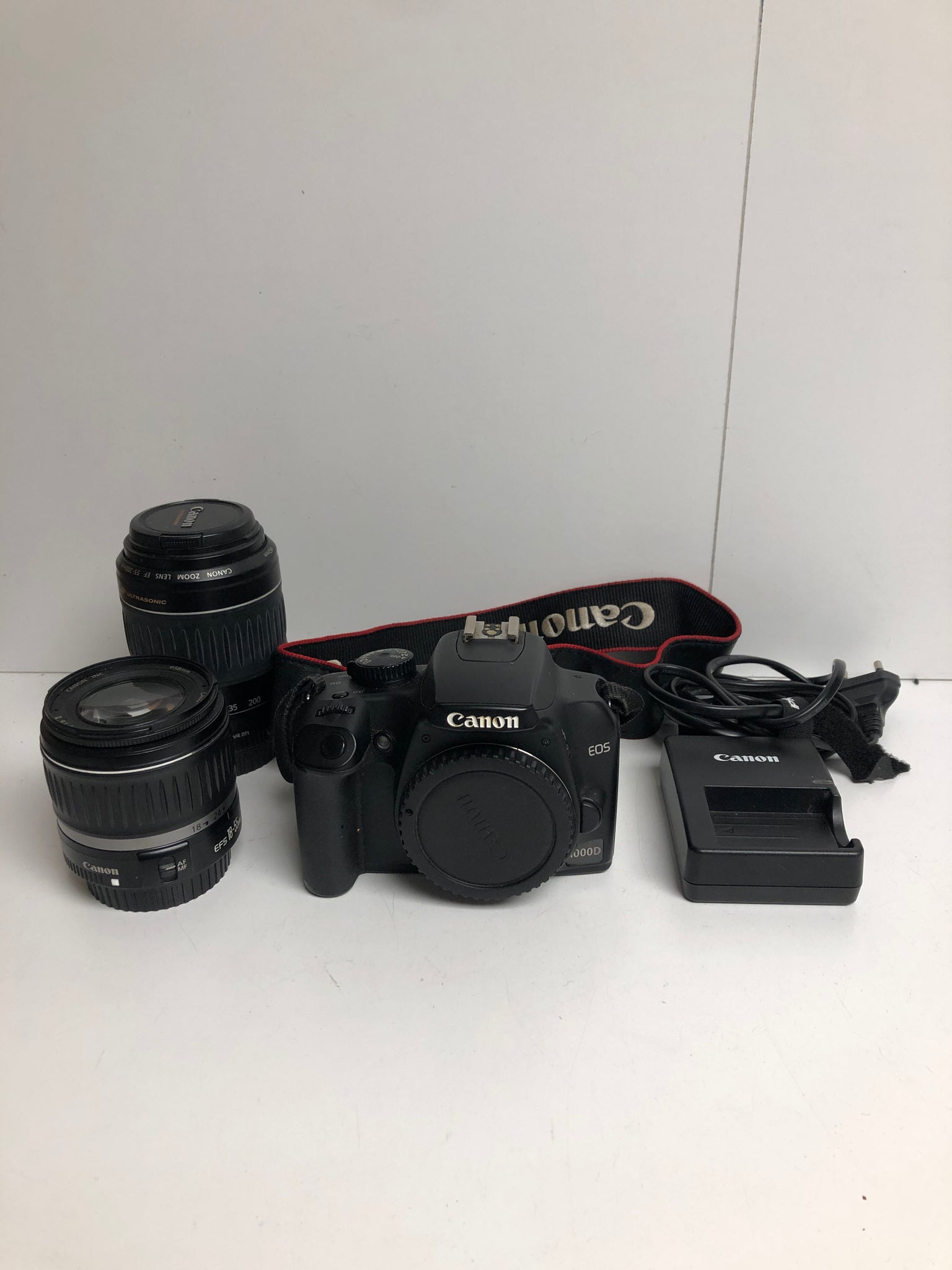 Canon 1000D with battery charger and power cable has two lenses - 18-55mm EFS lens and 55-22mm EFS lens