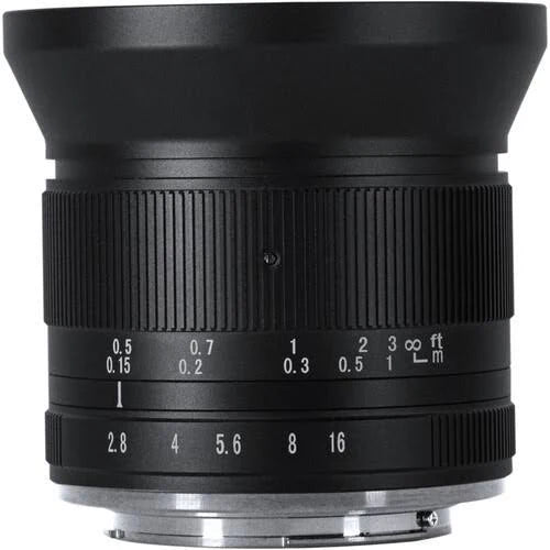 A compact wide-angle prime fx fit mount mirrorless cameras, this 12mm f/2.8 Mark II Lens from 7artisans Photoelectric is an all-manual lens well-suited for landscape, cityscape, and architectural subjects requiring a broad field of view. The lens's f/2.8 maximum aperture benefits working in a variety of lighting conditions and helps to maintain the small and lightweight form factor for handheld shooting. Its manual focus design is complemented by both depth of field and distance scales for utilizing pre-focusing and zone focusing techniques. Additionally, the lens permits working with subjects as close as 7.9" away.