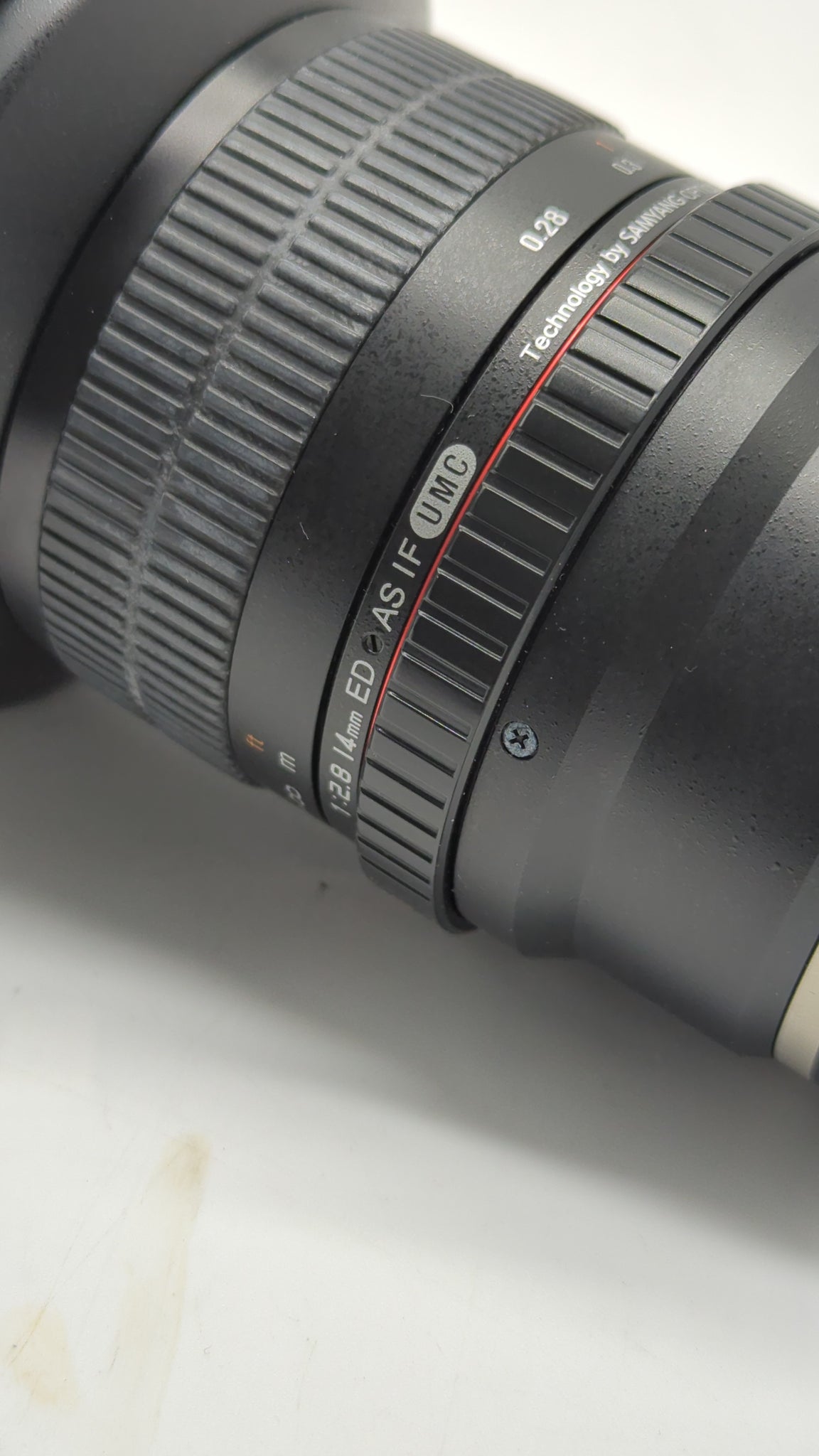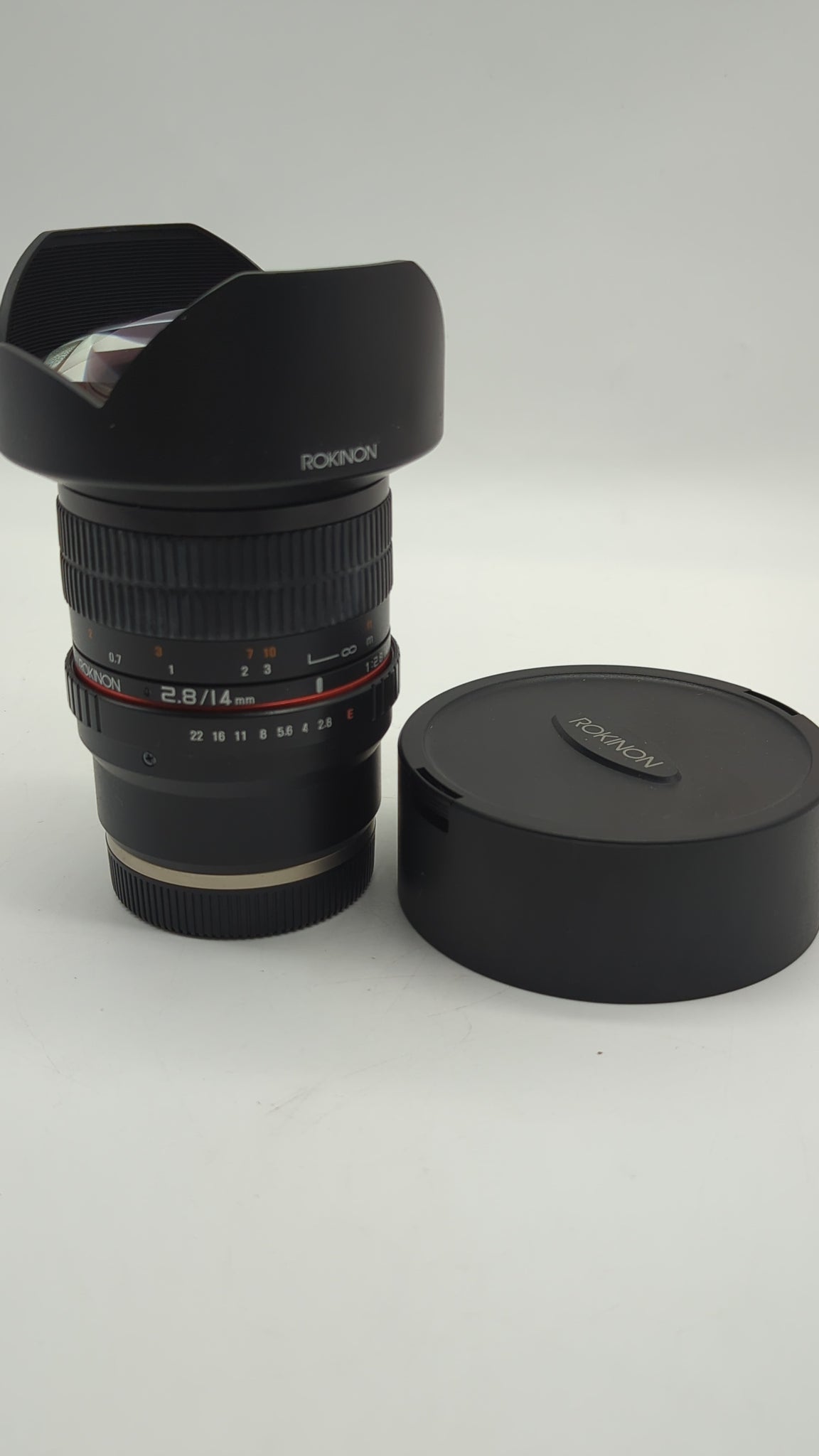 Rokinon 14mm f/2.8 IF ED UMC Super Wide Angle Lens - Lens Pouch - Front and Rear Lens Caps - Instruction Manual - Rokinon 1 Year Warranty Ultra wide-angle 14mm lens with an approximately 90deg. angle of view using an APS-C camera, for dramatic effects Lens is constructed with two ED lens elements, one hybrid aspherical lens element and one glass aspherical lens element, for outstanding, sharply defined images Minimal distortion and chromatic aberrations Super multi-layer coating to reduce flares and ghost images