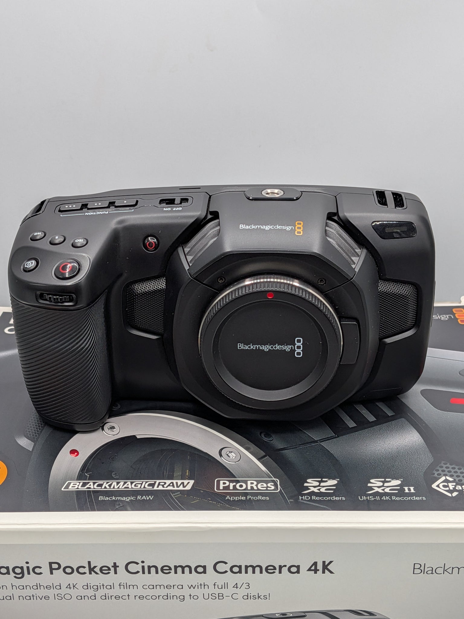 Blackmagic Design Pocket Cinema Camera 4K The Blackmagic Design Pocket Cinema Camera 4K features a 4/3" sensor for capturing up to 4096 x 2160 DCI 4K images at rates up to 60 fps in a variety of codecs including Blackmagic Raw at several bit rates and various ProRes 422 options. Slow-motion rates up to 120 fps are available in cropped Full HD. Its Micro Four Thirds lens mount accommodates the original, lightweight Pocket Cinema Camera lenses, and can be used with PL, C, EF, and other lenses with the use of separately available adapters. A dual-native ISO up to 25,600 is featured for low-light capture, and 13 stops of dynamic range provide rich HDR images. Record using the internal CFast 2.0 and SD/UHS-II card slots or employ the USB-C output for capturing longer clips to an external drive. The Pocket Cinema Camera 4K's 5" touchscreen LCD display reduces the need for an external, onboard monitor, while a full-sized HDMI port enables you to output a signal to a larger display. The menu and interface are the same as the ones found on the URSA Mini camera, and 3D LUTs can be applied for monitoring or for baking in your look when you're ready to commit. Audio features include a mini-XLR input with phantom power for pro-style mics, a 3.5mm jack, and an internal stereo mic. Additional features include the same Blackmagic OS as the URSA Mini, and Bluetooth remote control. A license key for DaVinci Resolve Studio is included for versatile post-production control. The Pocket Cinema Camera 4K's carbon fiber composite build provides lightweight strength and durability, and power options include running off the included Canon LP-E6 type battery or the included power supply.