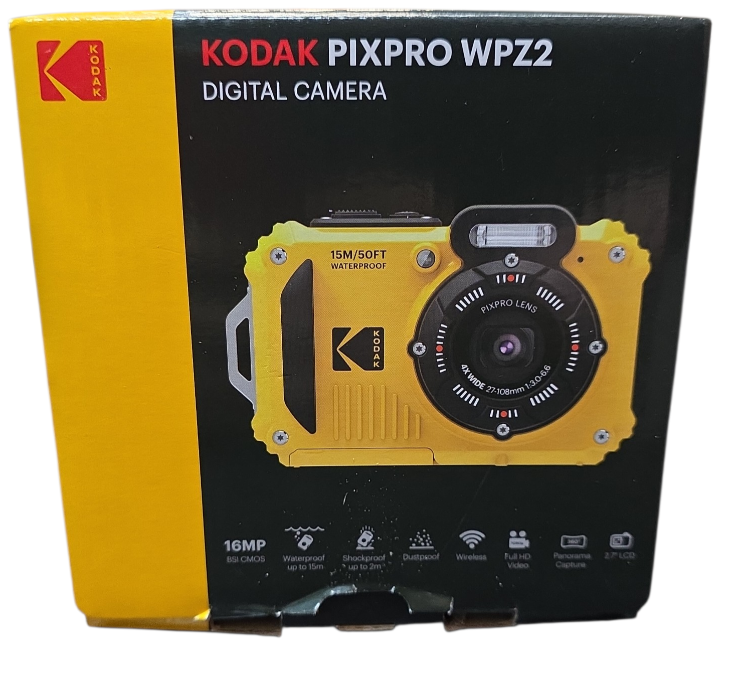 The Kodak PIXPRO WPZ2 is a rugged 16MP compact camera designed for action, featuring a 1/2.3" CMOS sensor, 4x optical zoom ( - mm equivalent), and a 2.7-inch LCD screen. It is waterproof up to 15 meters (49 ft), shockproof up to 2 meters, and dustproof. The camera records Full HD 1080p video, features built-in Wi-Fi, and uses a rechargeable Li-ion battery.