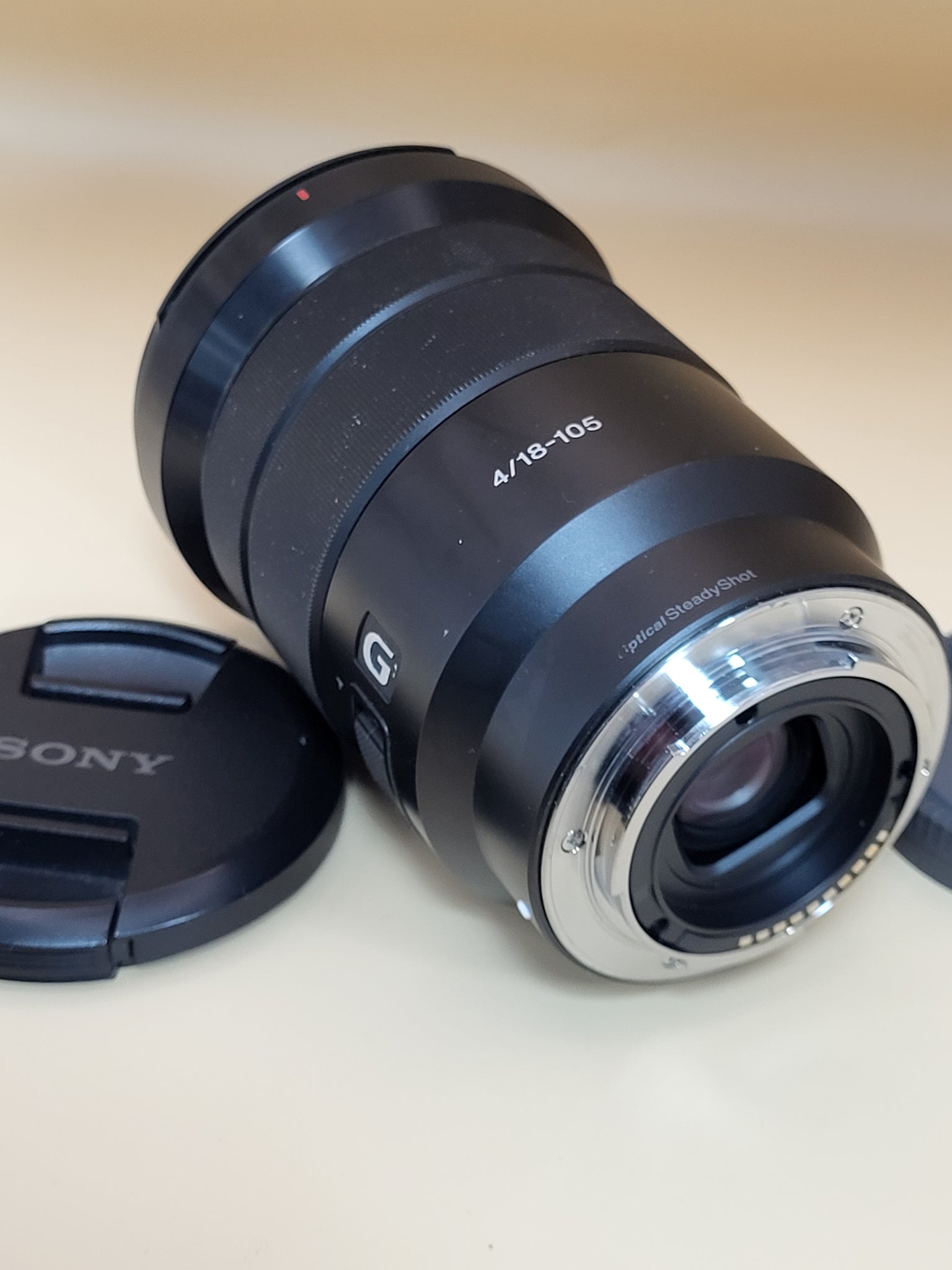 Some E-PZ ( Power Zoom ) 18-105 F4 Constant - Zoom lens - unboxed with caps Very clean optics with smooth zoom and focus - some light signs of use visable but these do not affect the excellent perfomance of the lens. As the first Sony G Lens designed specifically for E Mount cameras, the SELP18105G combines high image quality with a precise and quiet power zoom. The constant F4 aperture means you get stunning image quality even in low light. Are you filming? This powerful zoom uses Handycam technology to provide smooth zooming that is difficult to achieve manually. It's also very quiet so you won't startle your protagonists, while the integrated zoom lever allows you to maintain an even zoom speed. Known for their quality, G Series lenses offer excellent imaging performance with maximum contrast right to the edges of the image. The lens' builtin optical SteadyShot image stabilisation system ensures crisp, blurfree photos and video for handheld shooting. Instead of a standard polygon shaped aperture, this lens offers a circular aperture with 7 blades for a natural, soft bokeh. Aspherical lens elements ensure minimal distortion, while ED (Extralow Dispersion) glass elements ensure outstanding contrast, resolution and colour depth. The integrated focusing mechanism ensures a constant lens length, is easy to use and has a fast autofocus and a small minimum focus distance. In addition, the filter thread on the front of the lens does not rotate a clear advantage when using polarizing filters.
