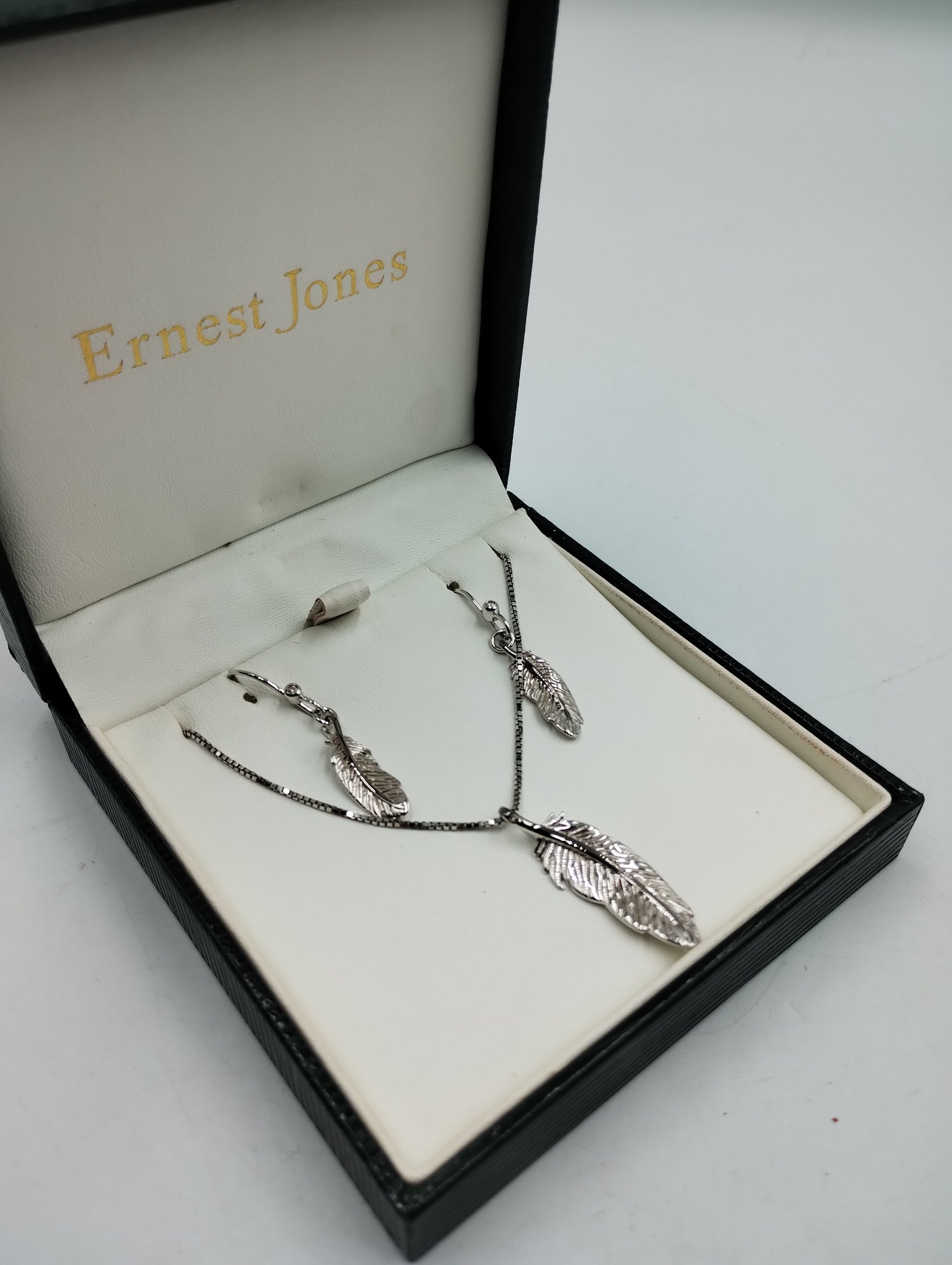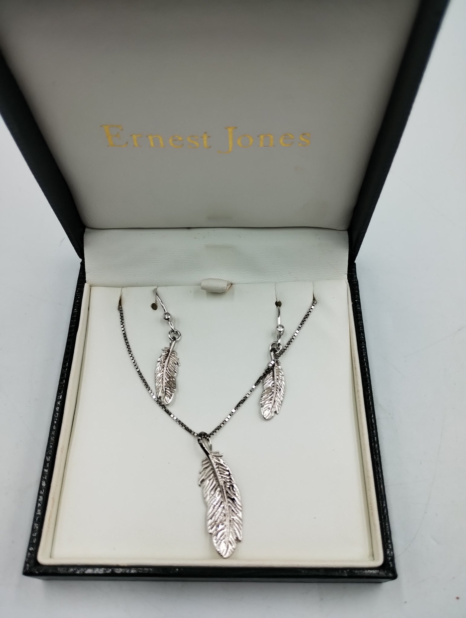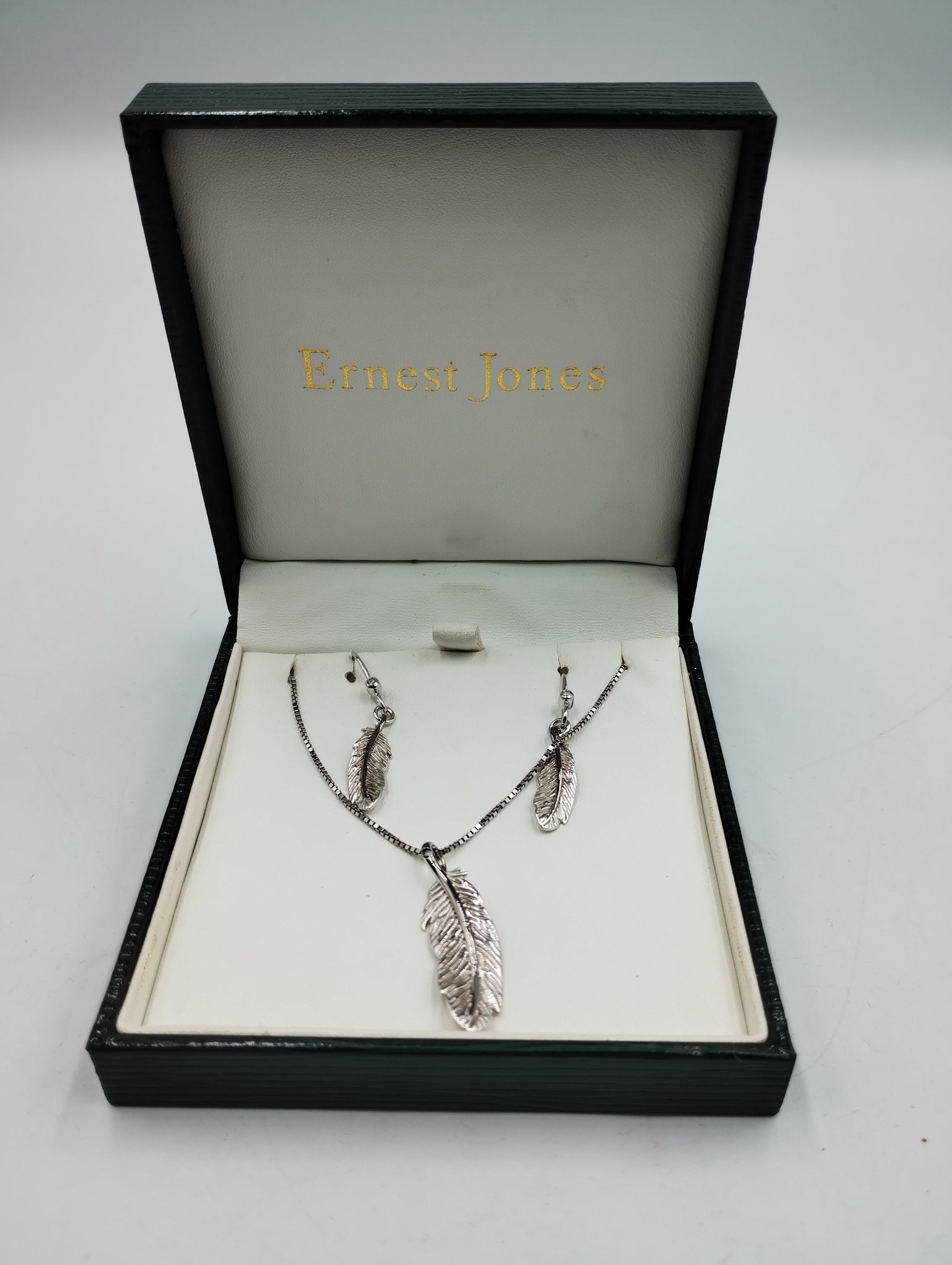 ERNEST JONES STERING SILVER FEATHER PENDANT NECKLACE & EARRING SET