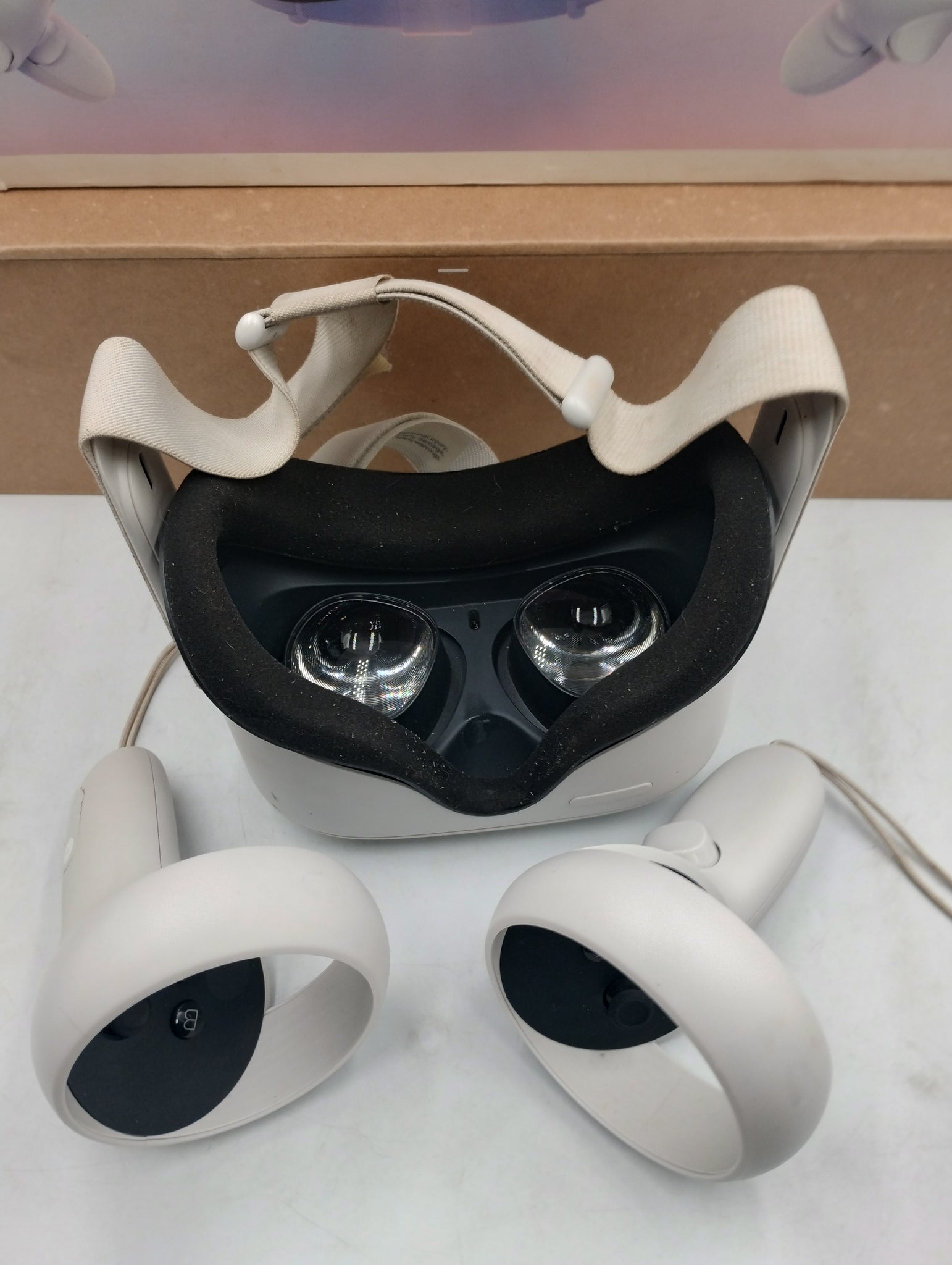 Manufacturer's description: Enjoy VR gaming without a PC or console with the Oculus Quest 2 Advanced All-in-One VR Headset. With improvements over the original Quest, the Oculus Quest 2 has a higher resolution display panel. At 1832 x 1920, it has 50% more pixels than the original Quest. Built using the Qualcomm Snapdragon XR2 processor and 6GB of RAM, the Quest 2 provides fast performance and next-gen graphics. BOXED IN FAIR CONDITION WITH SIGNS OF USE