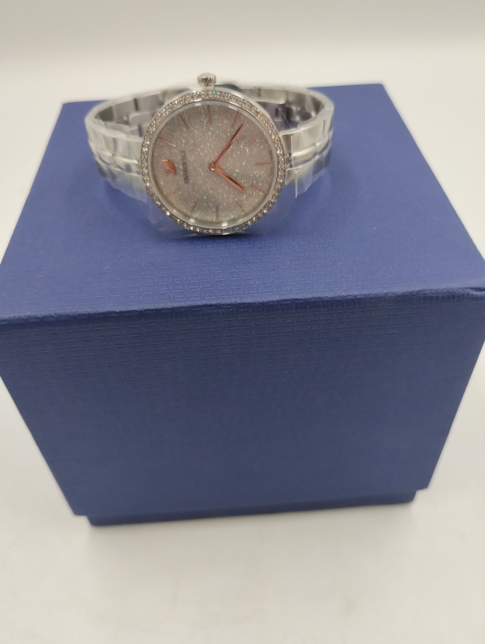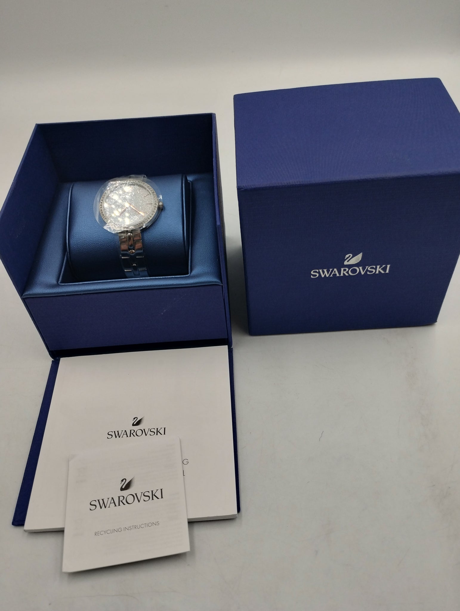Casual yet striking this Swarovski watch is a glamorous accessory that adds a sparkling touch to every outfit. The dazzling silver-tone dial and the stainless steel case create an alluring look. A stainless steel bracelet finishes the timeless design. The precise Swiss-made watch is water resistant up to 50 m and is an excellent combination of elegance and utility. BOXED IN EXCELLENT CONDITION. STILL HAS PROTECIVE WRAPPING ON THE WATCH