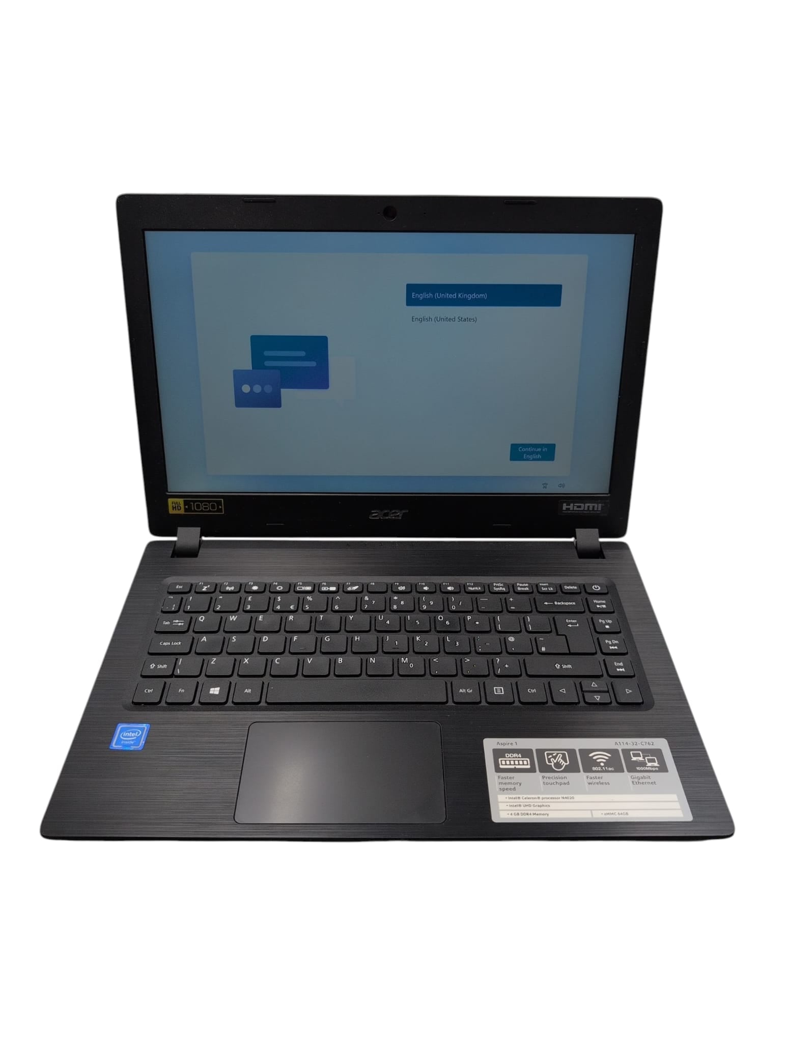 Acer Aspire 1 A114-32 Laptop Spacs: Intel Celeron N4020 CPU@1.10GHz Processor. Windows 11 Home Operating System. 4GB DDR4 RAM. 64GB eMMC Intel UHD Graphics. 14 Inch Screen.