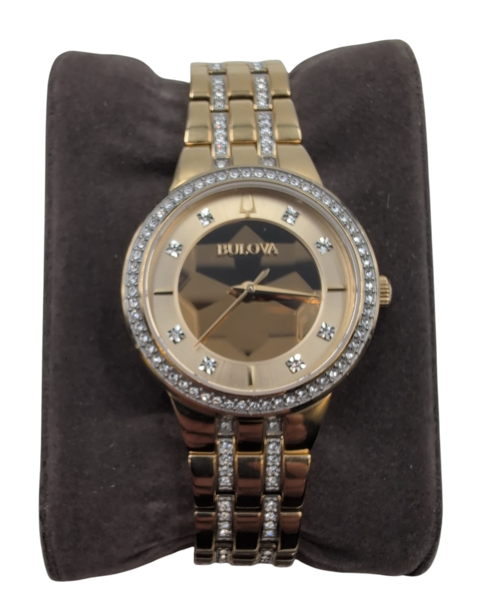 From the Crystal Collection, this ladies Bulova watch adds sparkle to your wrist featuring a 32mm wide gold-tone stainless steel case with matching multi-faceted dial to convey an intriguing 3-D look. Embellished with 120 crystals on the case and gold-tone stainless steel bracelet with a double push button folding clasp. Presented in a Bulova watch box.