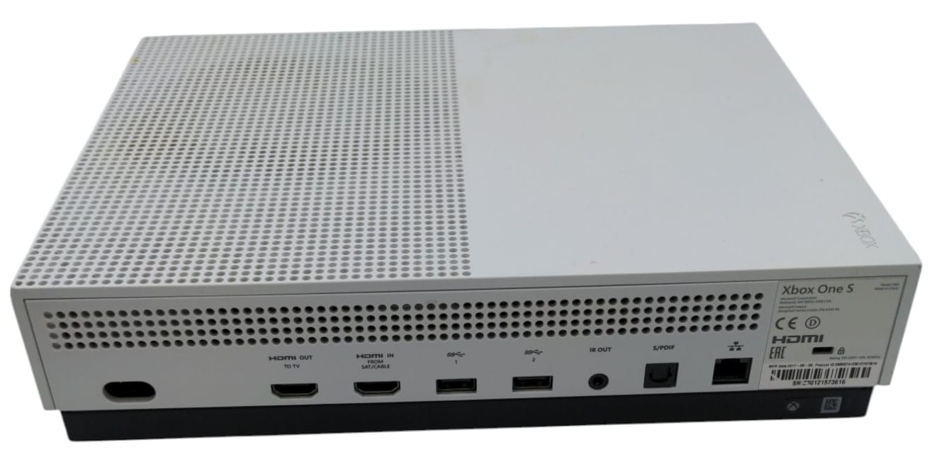 Microsoft Xbox One S White 500GB. Comes unboxed. Complete with one third party Xbox one control pad, power lead, HDMI cable and micro-USB lead for the control pad. Is in good condition, does have scratching and marks to the console. Used.