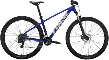 The Marlin 4 is the perfect entry-level mountain bike, ready to take you from scenic rail trails to challenging singletrack adventures. Designed for riders who need a bike that can handle rugged terrain while doubling as a tough commuter, it features Bontrager XR2 Comp tyres for traction and versatility. Equipped with disc brakes, front suspension, a 14-speed Shimano drivetrain, and mounts for racks and mudguards, it's an excellent choice for trail enthusiasts and campus commuters alike. Constructed from Alpha Silver Aluminum, the sleek frame offers strength without added weight. Tackle bumps and rough terrain with the SR Suntour XCE 28 suspension fork, offering up to 100mm of travel for a more comfortable ride. Whether you're hitting the trails or cruising through your daily commute, this entry-level mountain bike is built to handle it all with ease. With its rugged build and thoughtful design, the Trek Marlin 4 Gen 2 is the ultimate companion for beginners and recreational riders seeking a dependable bike.