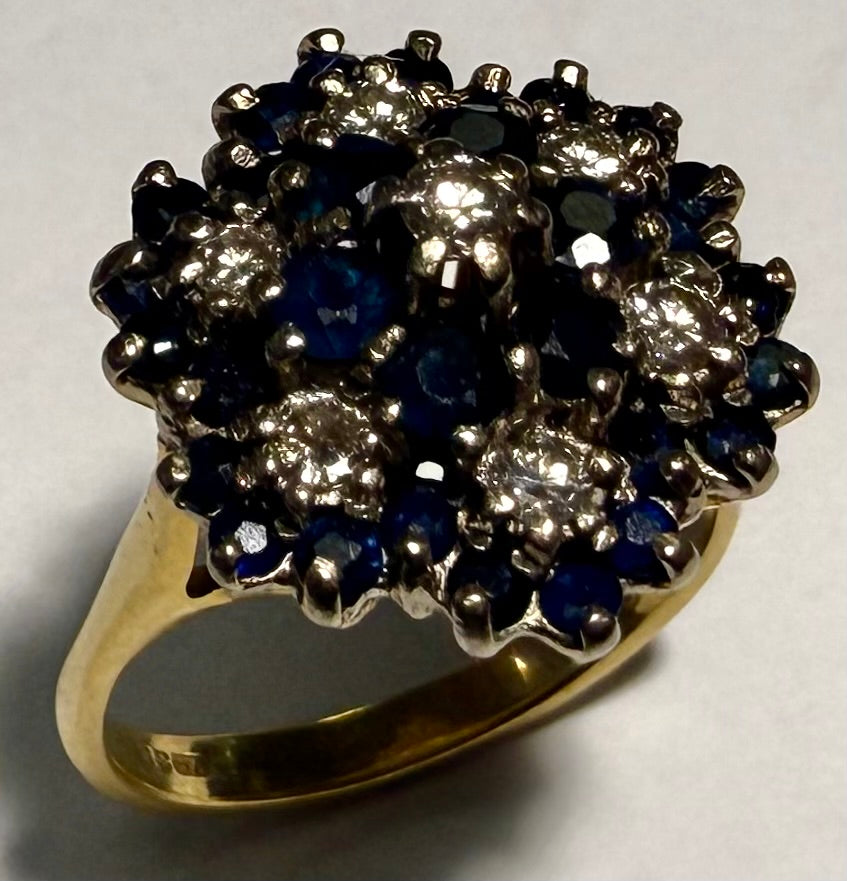 18CT Gold Diamond Cluster Ring in a size M 1/2. ***This cluster contains 7 diamonds surrounded by dark blue stones. The ring is in good condition and weighs 6.52 grams total. ***For any queries please call our Chorley store direct from Mon-Sat on 01257 752333.