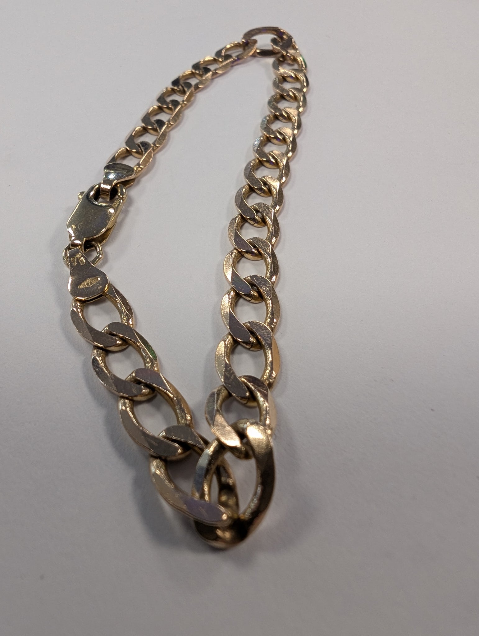 HERE WE HAVE A 9CT GOLD CURB BRACELET. THIS IS JUST OVER 8" LONG AND WEIGHS 8.70G *** FOR ANY QUERIES PLEASE CALL OUR CHORLEY STORE DIRECT MON-SAT 01257 752333