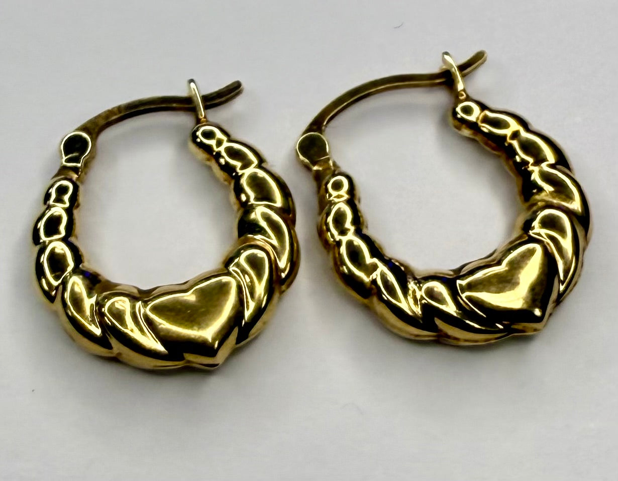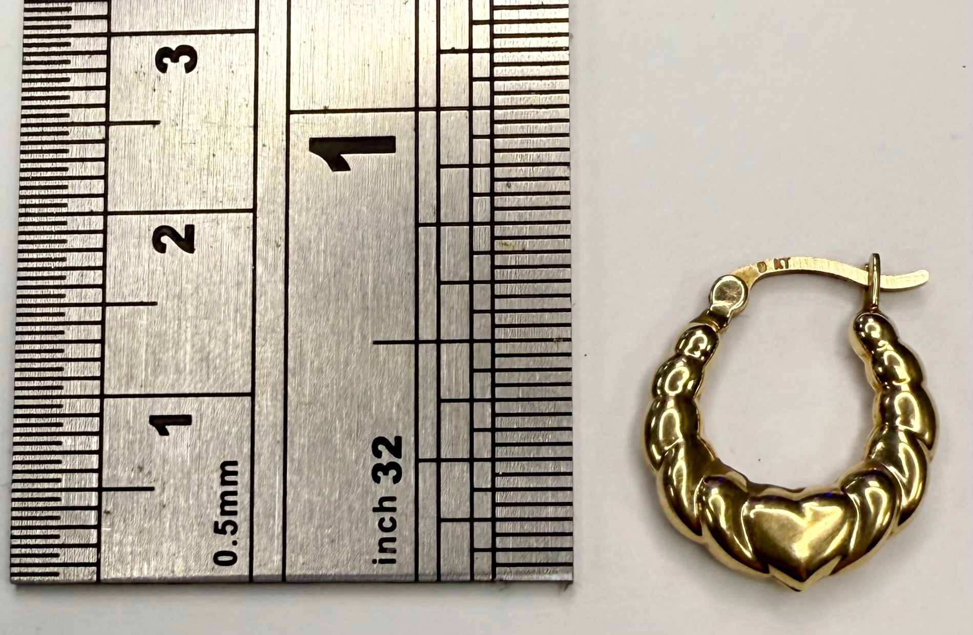 Here we have a pair of 9ct gold heart patterned hoop earrings. These are in good condition, hallmarked 375 and they weigh 1.14 grams total. *** For any queries please call our Chorley store direct from Mon-Sat on 01257 752333.