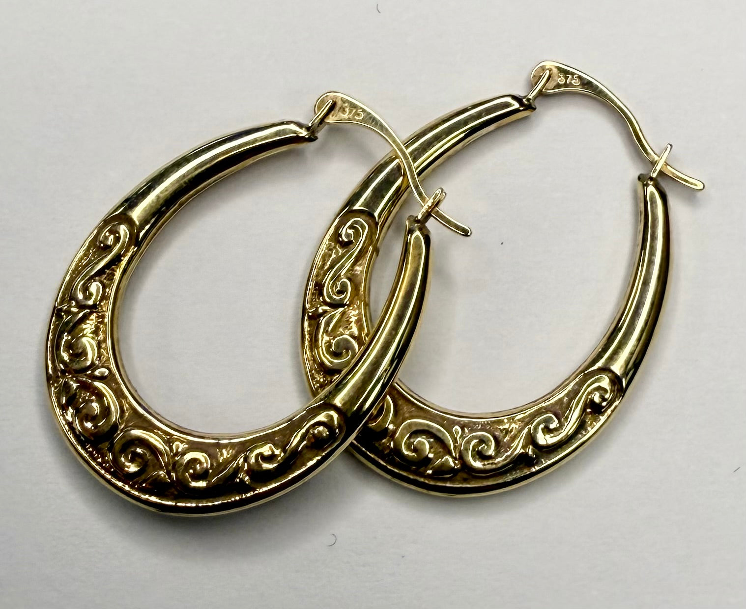 Here we have a pair of 9ct gold patterned hoop earrings. These are in good condition, hallmarked 375 and they weigh 0.96 grams total. *** For any queries please call our Chorley store direct from Mon-Sat on 01257 752333.