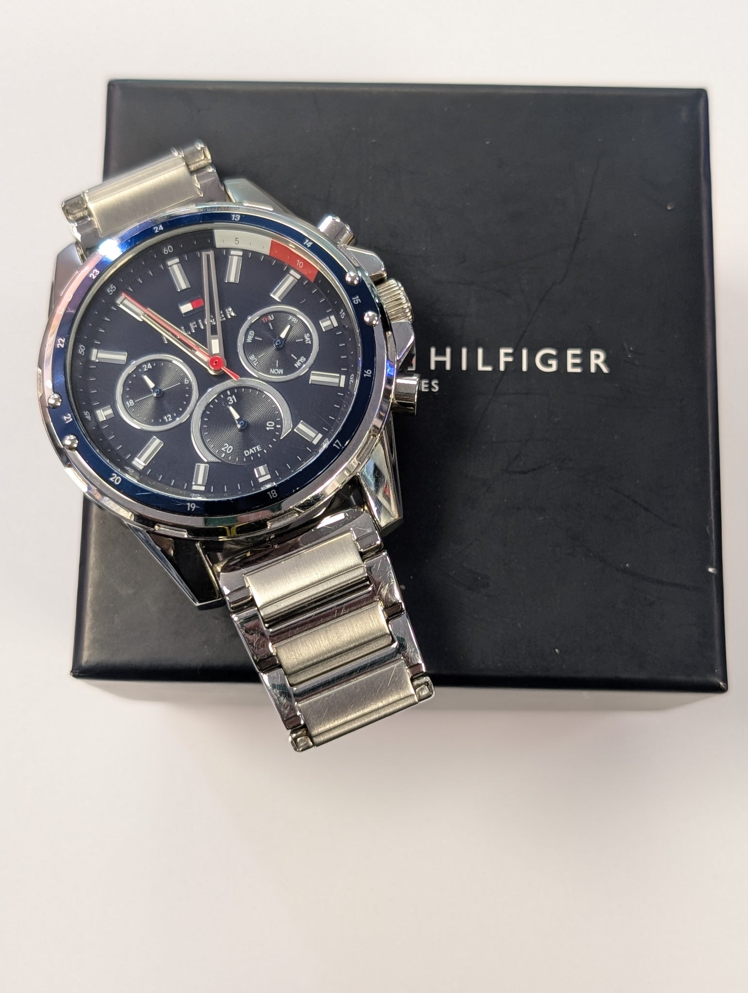 Here we have a Tommy Hilfiger men's watch with a blue face and a steel strap. This is in good condition and comes boxed with extra links. ***For any queries please call our Chorley store direct from Mon-Sat on 01257 752333.