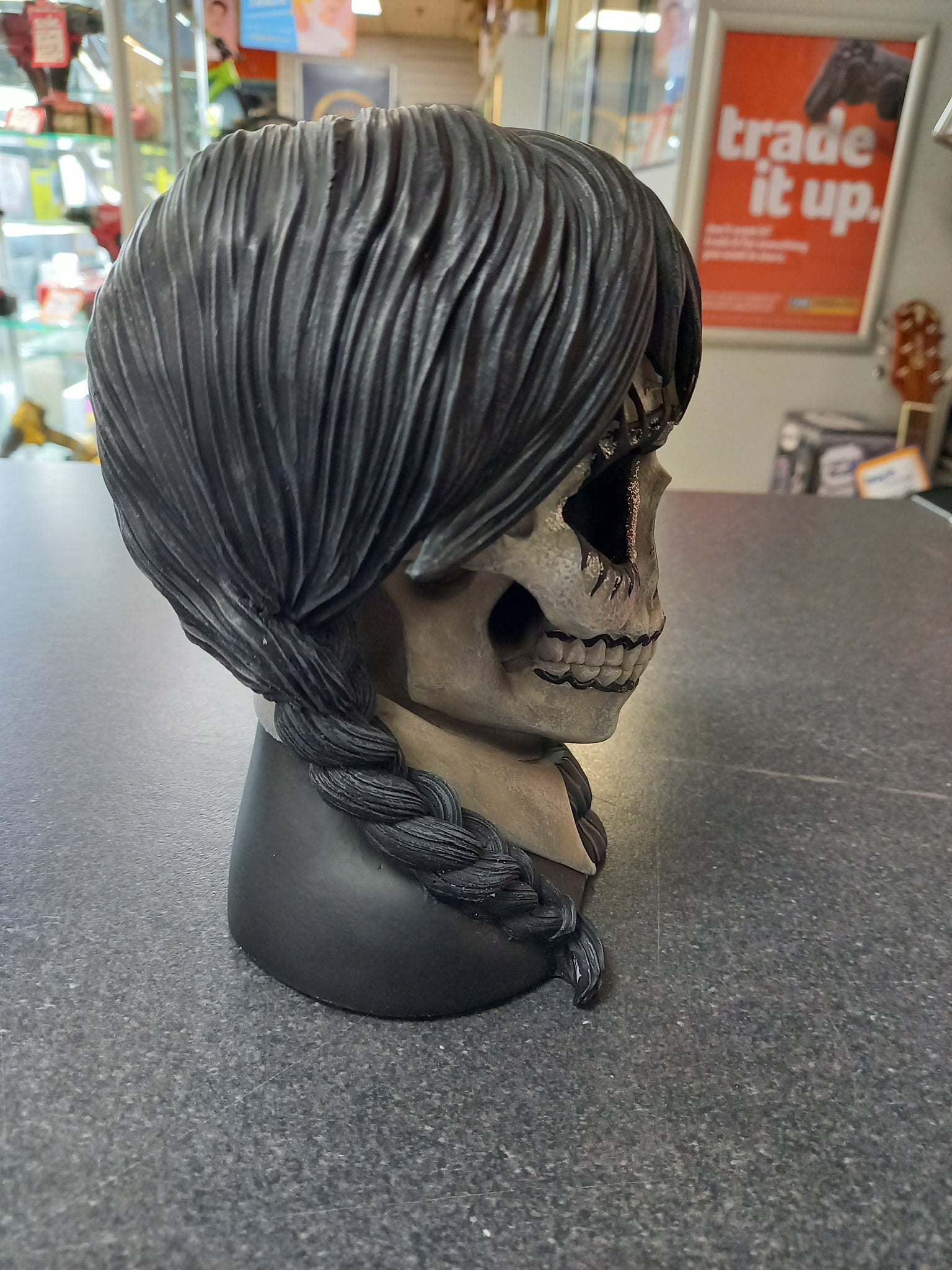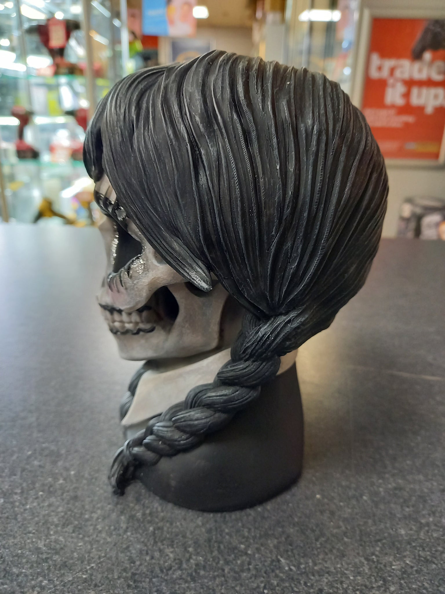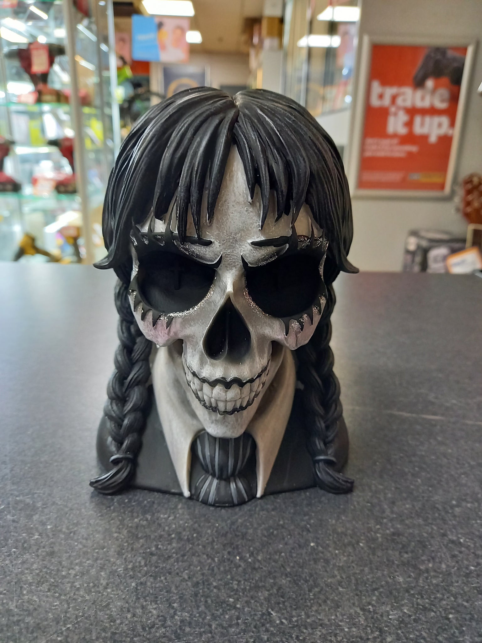 Dark Glare Skull: Gothic Glamour with a Bold Twist Add a touch of mystery and charm to your space with the Dark Glare Skull by Nemesis Now. This striking piece combines gothic style with a quirky, glamorous flair, featuring a skull adorned with wispy bangs and neat pigtails. The bold black-and-white design makes it a standout choice for anyone looking to elevate their home decor with an edgy yet elegant aesthetic. Crafted from high-quality resin and meticulously hand-painted, the Dark Glare Skull boasts incredible detail and durability. Glittering eye accents and intricate school uniform details, paired with plaited black hair, give this ornament a hauntingly beautiful allure. Whether displayed as a centerpiece or part of a larger gothic collection, it brings intrigue and drama to any room. Arriving in a beautifully designed gift box, the Dark Glare Skull is ready to impress straight out of the box. Perfect for gifting or as a unique addition to your decor, this piece is ideal for those who love bold, distinctive designs with a touch of the macabre. Make a statement with the Dark Glare Skulla must-have for fans of gothic style and alternative decor. Bring this unforgettable piece into your home and embrace its dark, whimsical charm!