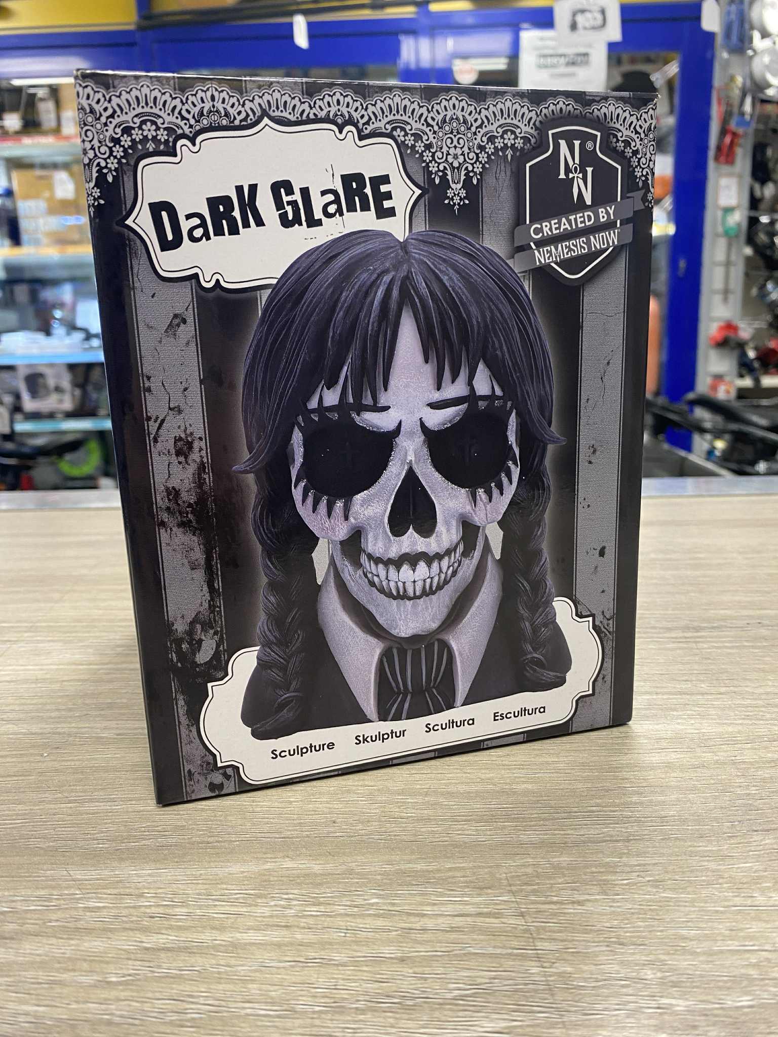 Dark Glare Skull: Gothic glamour with a twist – bold, mysterious, and unforgettable. The Dark Glare Skull is a captivating ornament designed by Nemesis Now, blending dark gothic elements with a touch of glamorous charm. This striking piece features a skull adorned with wispy bangs and neat pigtails, adding a mysterious and quirky character. The monochrome design, with bold black and white contrasts, makes it a standout item for anyone seeking an edgy yet elegant home decor piece. Hand-painted with incredible detail and cast in the finest resin, the Dark Glare Skull is not only durable but also truly unique. The skull’s glittering eye accents and intricate school uniform, paired with plaited black hair, give it a hauntingly beautiful appearance. Whether displayed on a shelf or as part of a larger gothic collection, this piece effortlessly adds a touch of intrigue and drama to any room. Arriving in a striking gift box that perfectly complements the skull's design, the Dark Glare Skull is ready for display right out of the box. The packaging reflects the gothic glamour of the piece, making it an ideal gift or statement piece for your home. It’s perfect for those who appreciate dark, whimsical decor with a high-quality finish. Designed for fans of gothic and alternative style, this skull is perfect for anyone who loves unique, eye-catching decor. Whether you’re an admirer of Nemesis Now’s gothic collection or simply drawn to the mysterious charm of skull designs, this ornament will add a bold statement to your space. The Dark Glare Skull is for those who enjoy quirky, bold pieces that make a statement. Bring the macabre and the magical into your home with the Dark Glare Skull – a must-have for those who crave distinctive, glamorous decor.