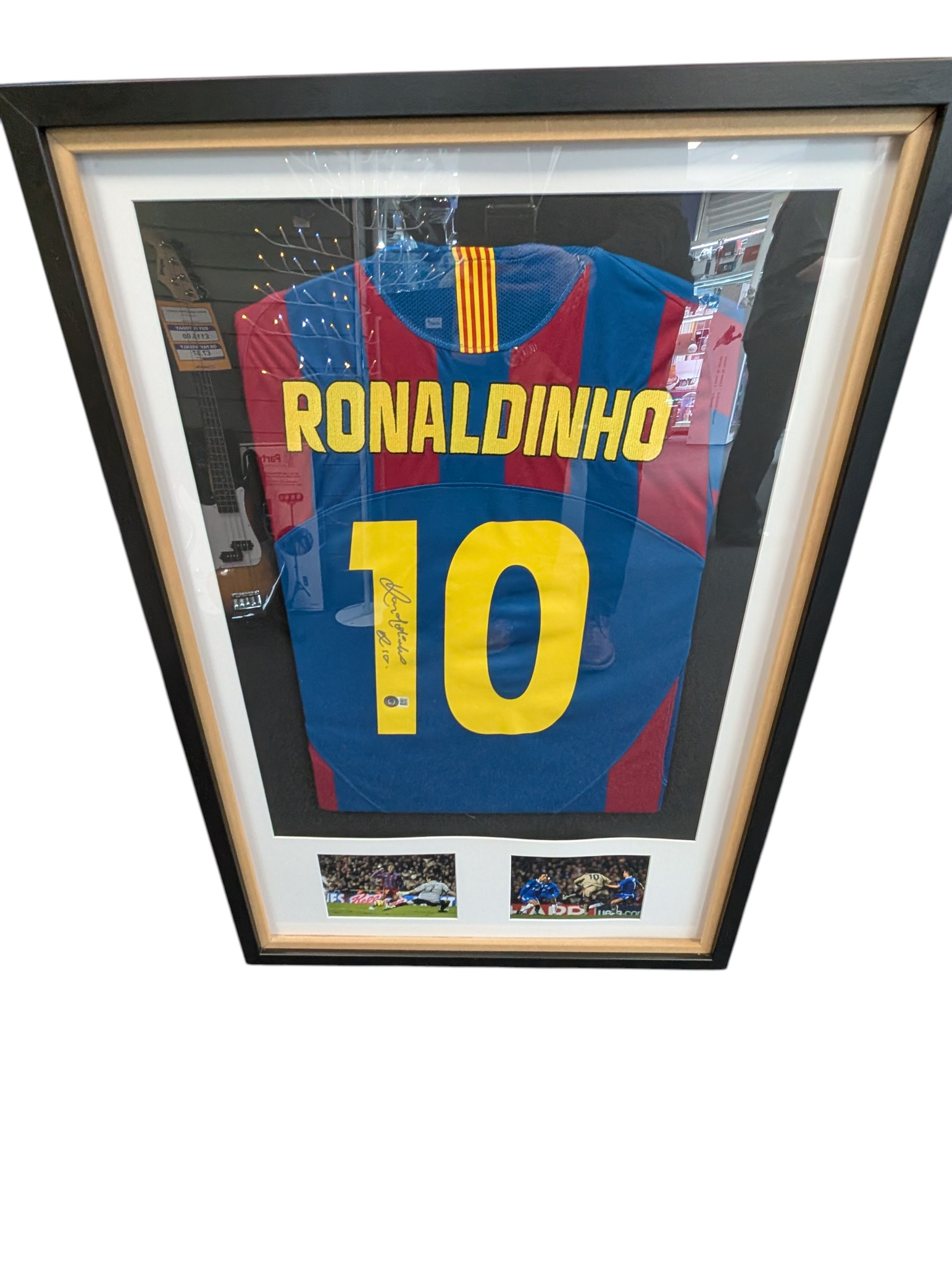 HERE WE HAVE A BECKETT AUTHENTICATED SIGNED RONALDINHO FOOTBALL SHIRT FRANED. THE FRAME IS 25.5" WIDE & 37" HIGH. THERE IS SOME COSMETIC MARKS ON THE PERSPEX *** FOR ANY QUERIES PLEASE CALL OUR CHORLEY STORE DIRECT MON-SAT 01257 752333