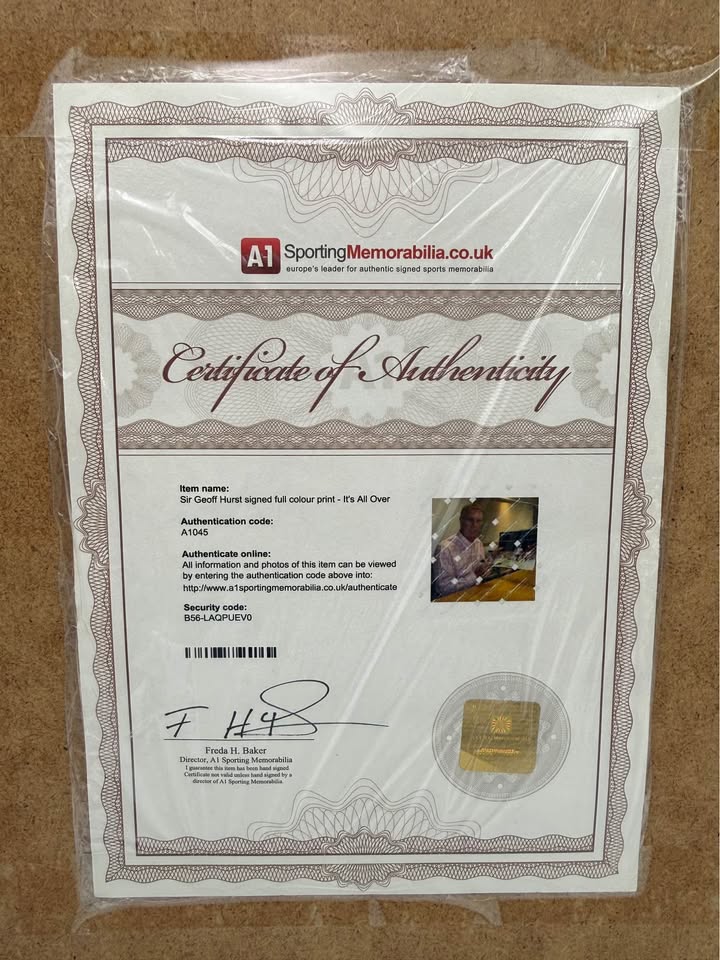 OWN A PIECE OF FOOTBALL HISTORY WITH SIGNED PHOTO OF SIR GEOFF HURST'S ICONIC FINAL GOAL IN THE 1966 WORLD CUP! THIS IS MORE THAN JUST A PHOTO IT'S A TANGIBLE CONNECTION TO ONE OF THE GREATEST MOMENTS IN ENGLISH SPORTING HISTORY . AUTHENTICATED & SIGNED BY THE LEGEND HIMSELF THIS IS MUST HAVE FOR ANY SERIOUS COLLECTOR OR PASSIONATE ENGLAND FAN
