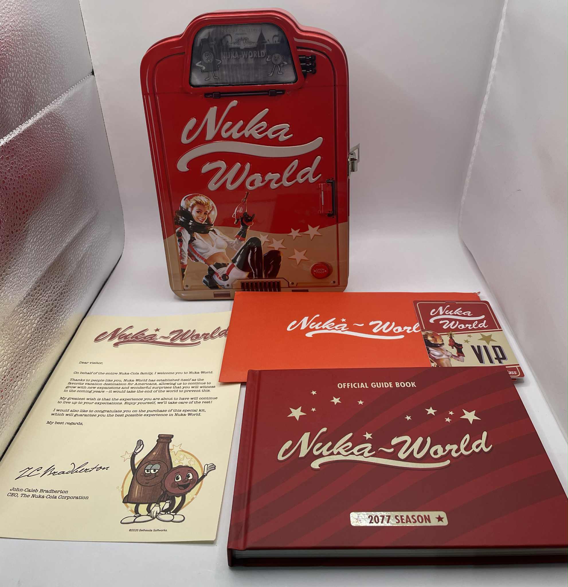 Fallout nuka-word welcome tin Fallout Nuka-World, a place with all the zip of Nuka-Cola, with rivers made of quantum and fizzy mountaintops. This kit contains the key to all the fun, games and rides here at Nuka-World, a park with every minimum acceptable safety standard met. Walk through the stars or blast off to the future at Galactic Zone, Pan for gold alongside Mad Mulligan at Dry Rock Gulch, witness the magic at Nuka-Cola Bottling Plant, go for a spin at Kiddie Kingdom or relive the good old days at Fizztop Mountain, Nuka-Town U.S.A. enjoy some Monkey business on the Safari Adventure.