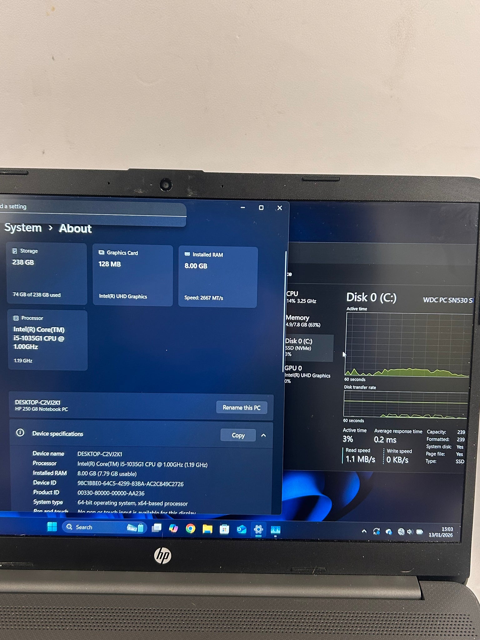 HP 250 G8 Laptop In good condition with charger Windows 11 pro i5-1035G1 @ 1.00GHz 8GB RAM 256GB SSD