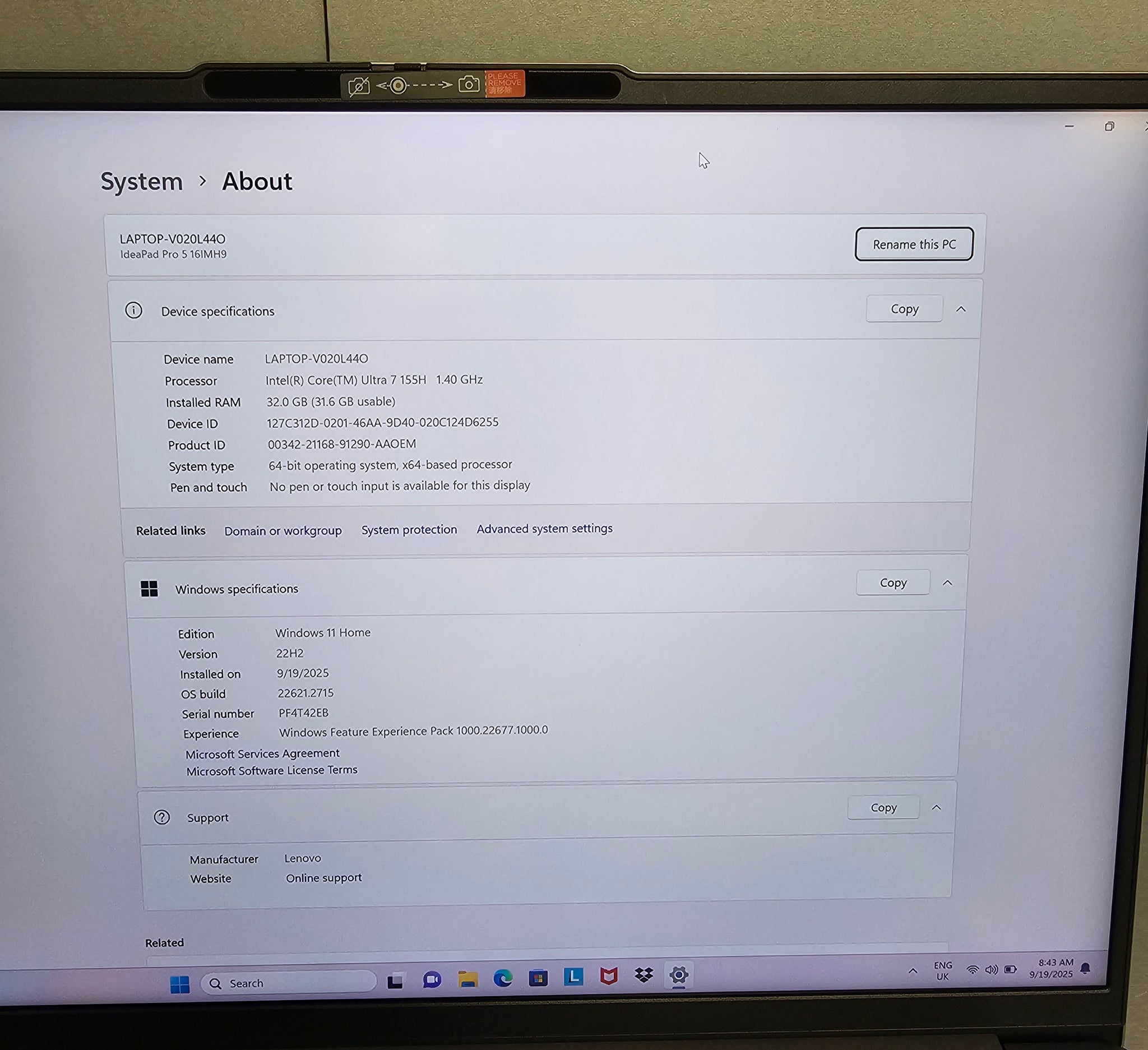 System Specs: View All Models > Processor Intel® Core™ Ultra 7 155H Processor (16 Cores) Operating System Windows 11 Home 64 Graphic Card Integrated Intel® Arc™ Graphics Memory 32 GB LPDDR5X-7467MT/s (Soldered) Storage 1 TB SSD M.2 2242 PCIe Gen4 TLC Display 16" WQXGA (2560 x 1600), IPS, Anti-Glare, Non-Touch, 100%sRGB, 350 nits, 120Hz, Narrow Bezel AC Adapter / Power Supply 100W Pointing Device ClickPad Keyboard White Backlit, Storm Grey - English (UK) WIFI Wi-Fi 6E 2x2 AX & Bluetooth® 5.1 or above Colour Arctic Grey Brand ideapad Screen Resolution 2560x1600 Ports 2 x Type C(1 x USB+PD+DP + 1 x TBT Intel/USB 4.0 AMD + Audio) + 1 x HDMI 2.1 (supports 4096 x 2160@60Hz) TMDS + Micro SD Card Reader + Audio Jack + 2 USB 3.1(Type A) Gen1