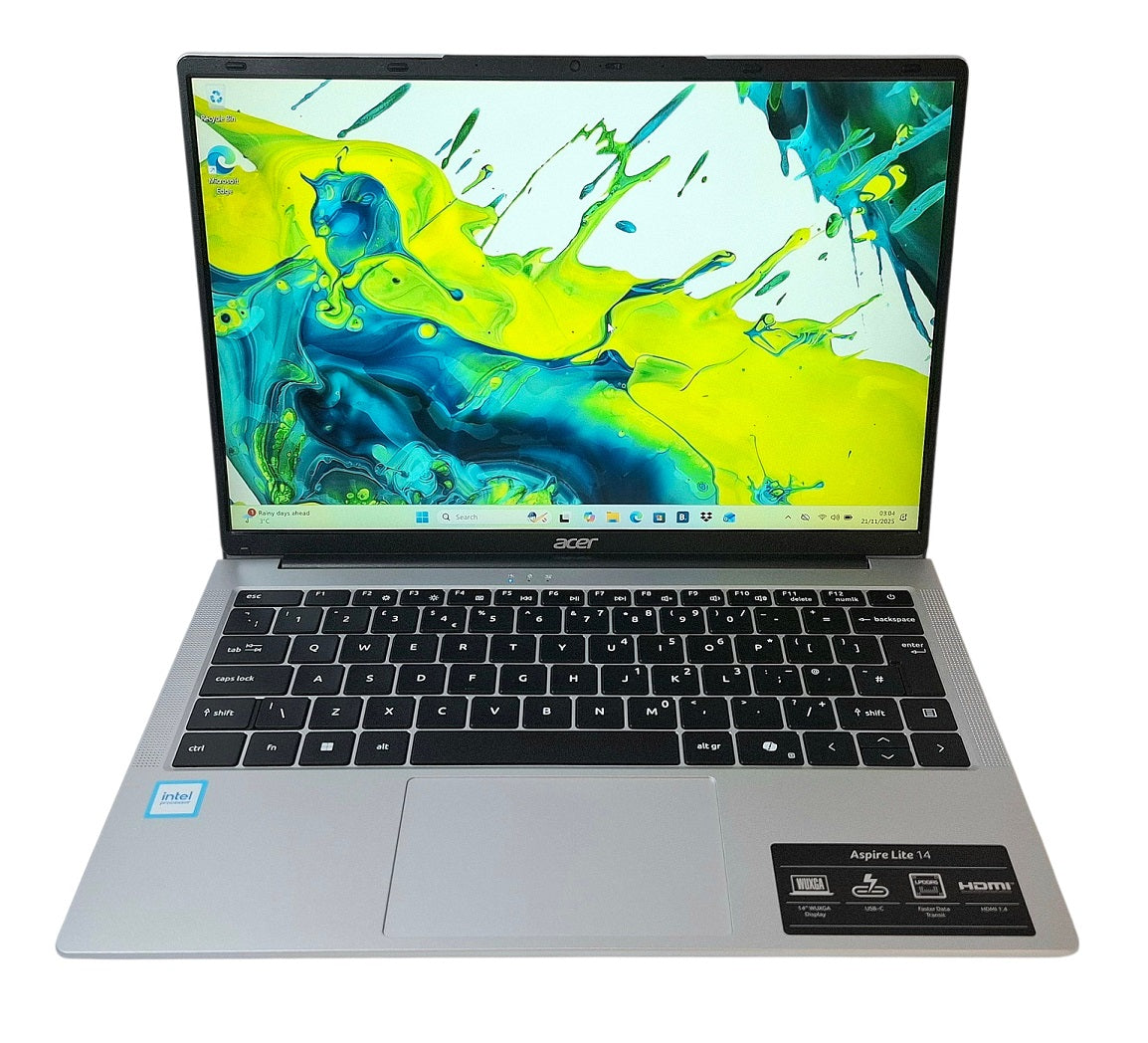 The Acer Aspire Lite 14 is a budget-friendly laptop with an Intel N150 processor, 4GB of RAM, and a 128GB SSD, designed for everyday tasks like web browsing and document editing. It features a 14-inch, 1920x1200 resolution IPS display with a 16:10 aspect ratio for more screen detail and includes a variety of ports, like USB-C, USB-A, and a MicroSD card reader. The device runs on Windows 11 (in S-mode) and has Wi-Fi 6 for fast internet connectivity.
