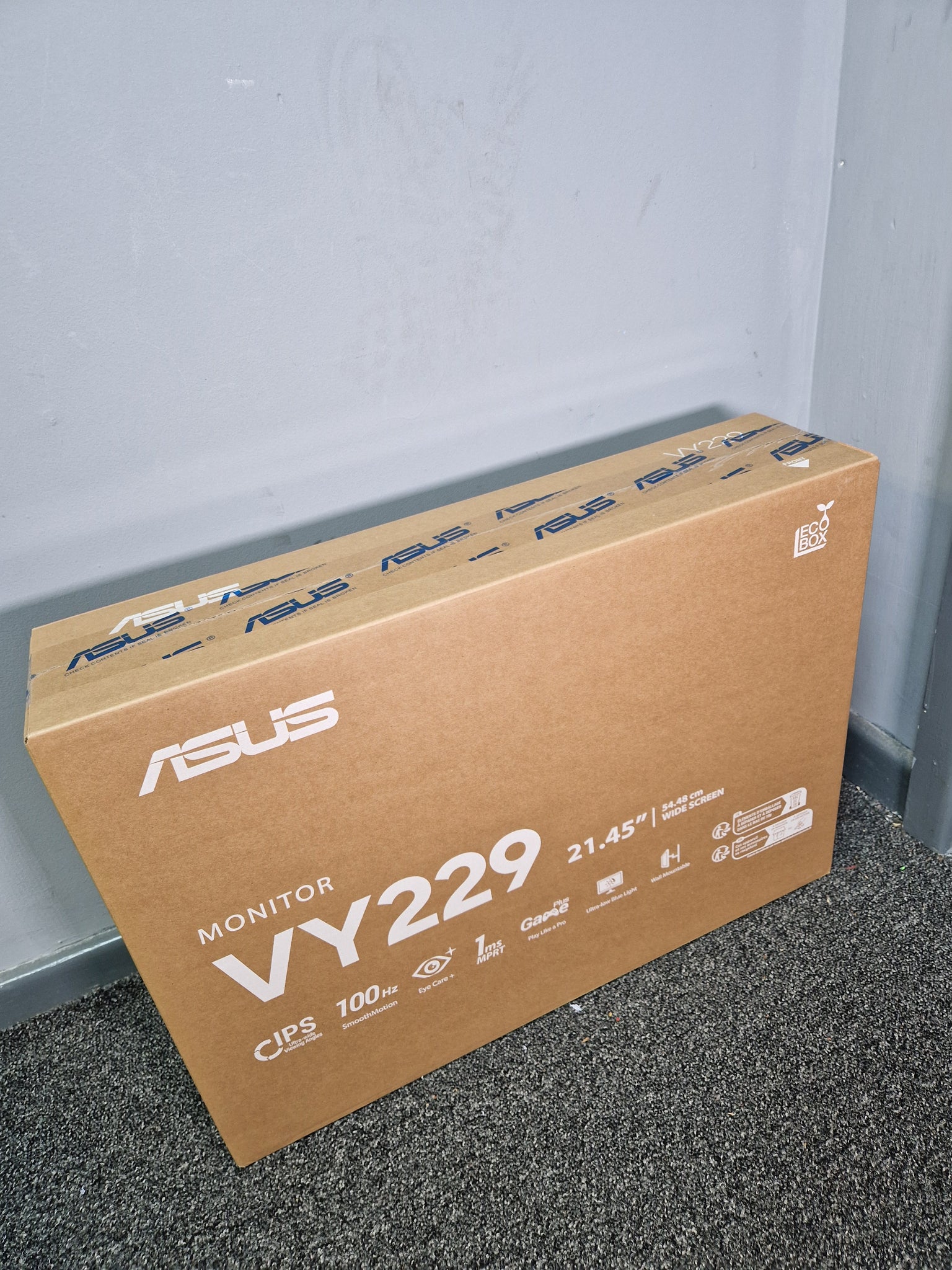 ASUS VY229HF Eye Care Gaming Monitor 22 inch(21.45 inch viewable) FHD (1920 x 1080), IPS, 100Hz, IPS, SmoothMotion, 1ms (MPRT), Adaptive Sync, Eye Care Plus technology, Blue Light Filter, Flicker Free, antibacterial treatment Fluid viewing experience with 100Hz Smooth Motion Giving you more fluid animation in video, casual gaming, and day-to-day work, can all benefit from the smoother-than-ever experience. IPS panel technology for an astounding 16.7 million colors The 21.45-inch FHD (1920 x 1080) IPS panel offers a palette of 16.7 million colors, so photos and videos have stunning detail and realism. The panel also offers 178° viewing angles to ensure excellent image quality from almost any perspective. 100 Hz refresh rate and Adaptive-Sync technology for smooth visuals A 100Hz refresh rate and 1ms Moving Picture Response Time (MPRT) help reduce smearing and motion blur, making VY229HF perfect for fast-paced games that require quick reactions to whats happening onscreen. In addition, Adaptive-Sync technology helps eliminate screen tearing and choppy frame rates for ultra-smooth gameplay. Adjustable ASUS Blue Light Filter An integrated TÜV Rheinland-certified ASUS Blue Light Filter protects eyes from harmful blue light. Settings can be quickly accessed via the onscreen display (OSD) menu, and an intuitive slider makes it easy to adjust filter levels to suit any scenario or user preference. Long-lasting antibacterial treatment The bezels and hotkeys on VY229HF feature an antibacterial ionic silver treatment. By preventing bacteria adhesion by up to 99.9%, it keeps key areas of the monitor clean and hygienic, potentially reducing the spread of harmful bacteria. VY229HF has been subjected to the ISO 22196 Antimicrobial Activity and Efficacy tests conducted by independent testing lab TÜV SÜD.